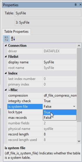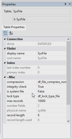 - Double clicking on the SysFile brings up the Properties Panel for this table.