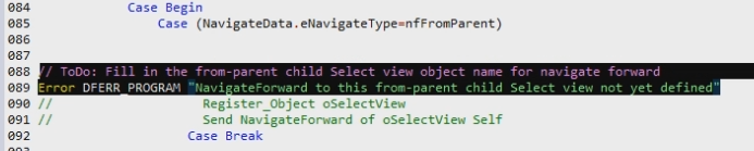 - oNavigateForward gets information from being past in to it in a struct called NavigateData. In navigate data there is an eNavigateType, which tells us how we got into this view. In this case we’re going to show this label if we came from a different Select View. So from nfFromParent we will enable this label.