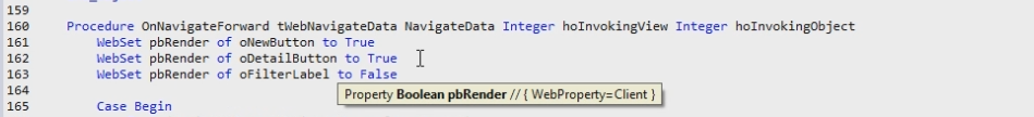 - Go to the event onNavigateForward (line 160), which is called as soon as this View is opened. By default say: Webset pbRender of oFilterLabel to False.