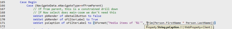 - Also enter: WebSet psCaption of oFilterLabel to (SFormat(“Media items of %1’”, Trim(Person.FirstName * Person.LastName))) the percentage will be replaced by SFormat.