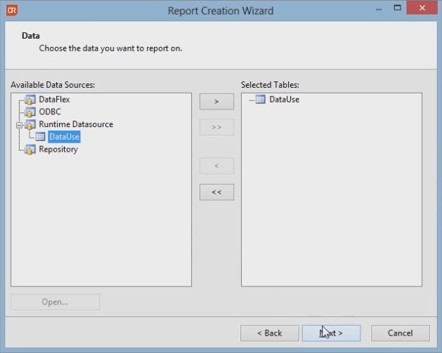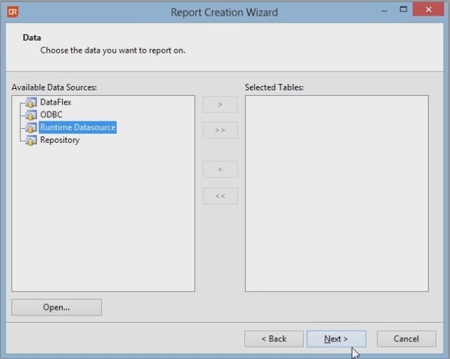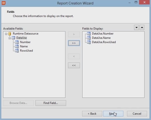 Press next, select all the colums from the runtime data source, and add them to the details section of the report.