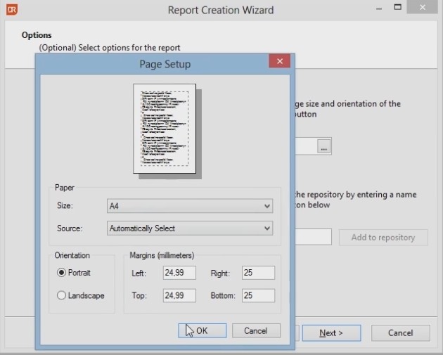 Skip the apply filters tab, change the papersize to A4. And finish the wizard.