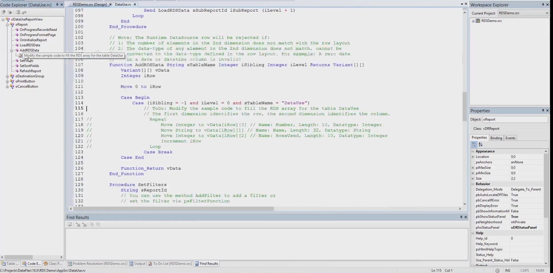 The results of the wizard are loaded in the DataFlex studio, the wizard couldn’t complete all the code because it doesn’t know what data should be placed in the RDS array.