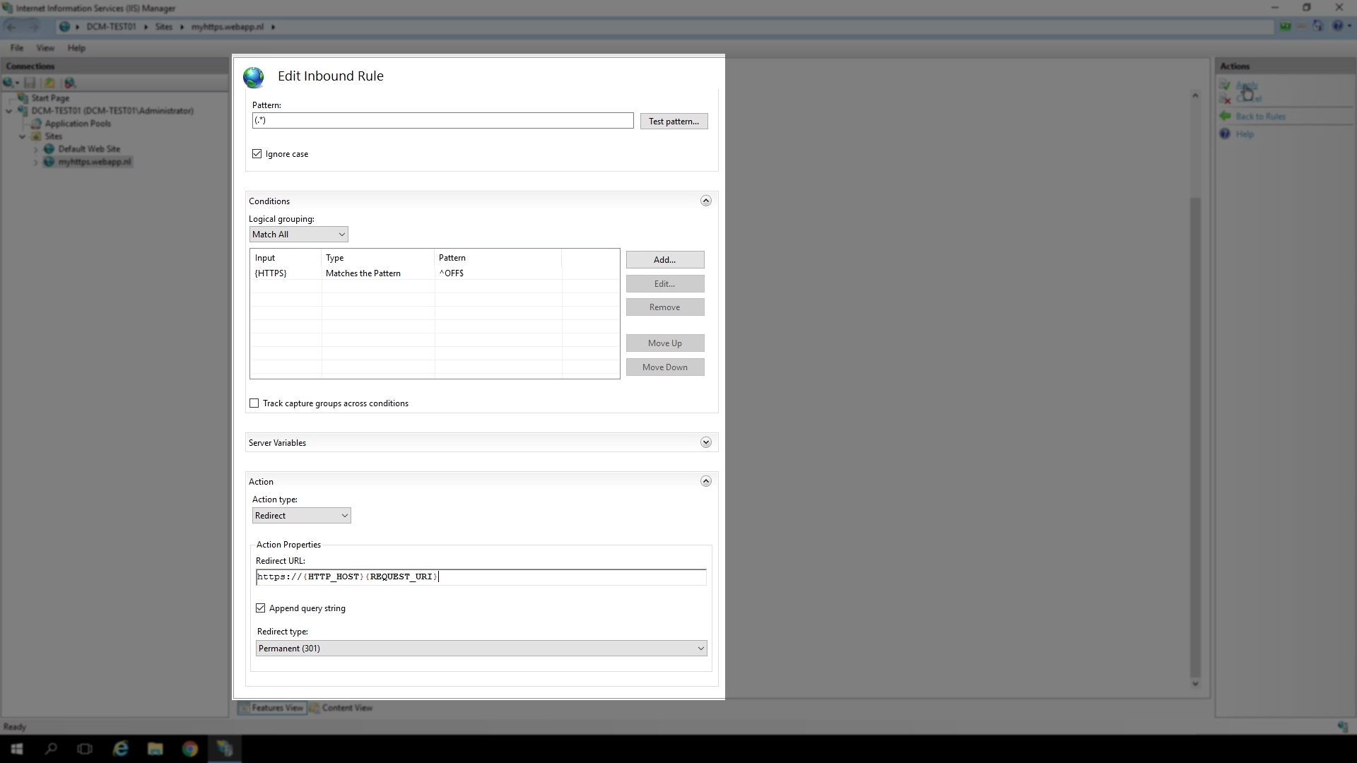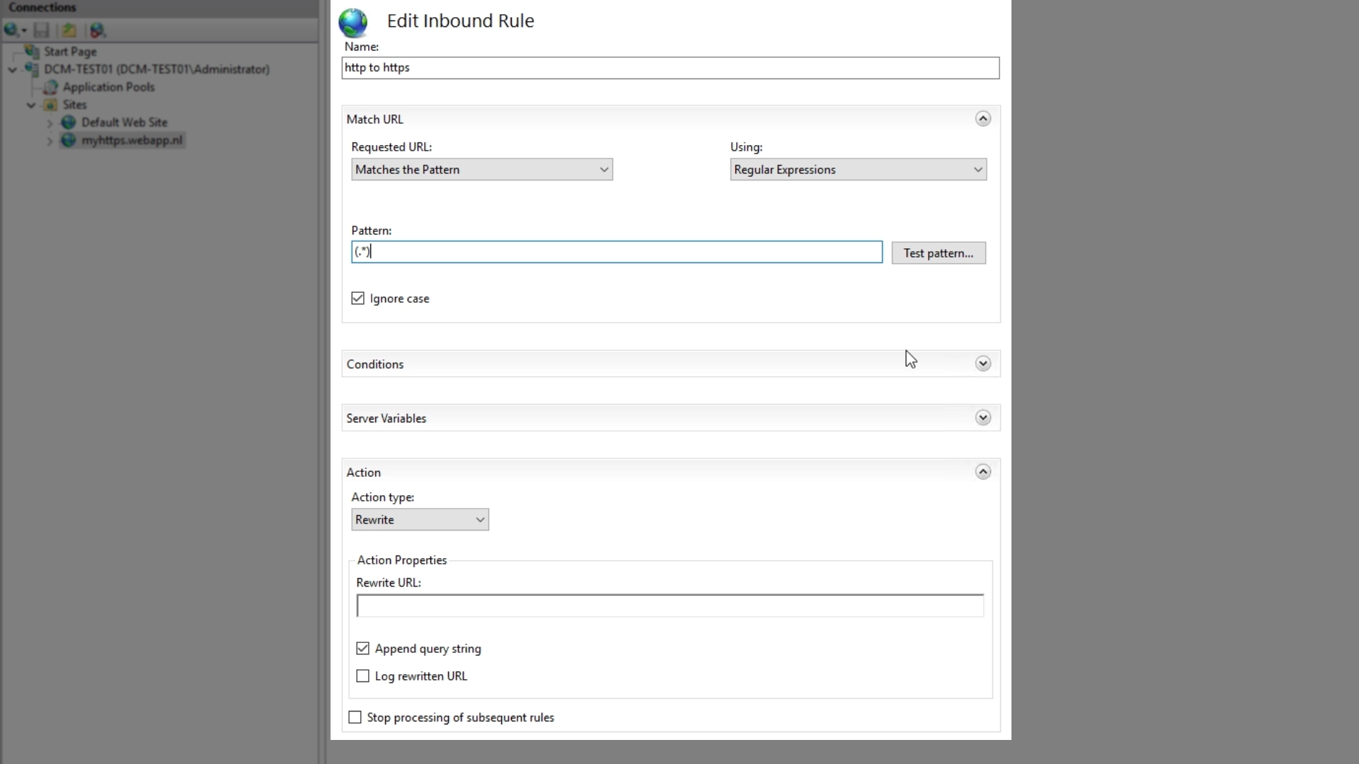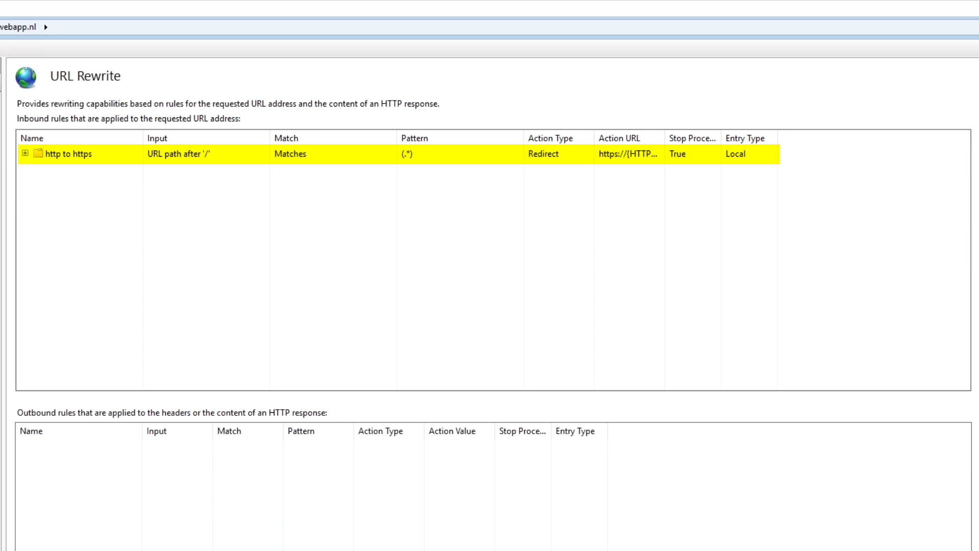 A rule with the name “http to https” has been created, and now shows in the ‘URL Rewrite’ pane