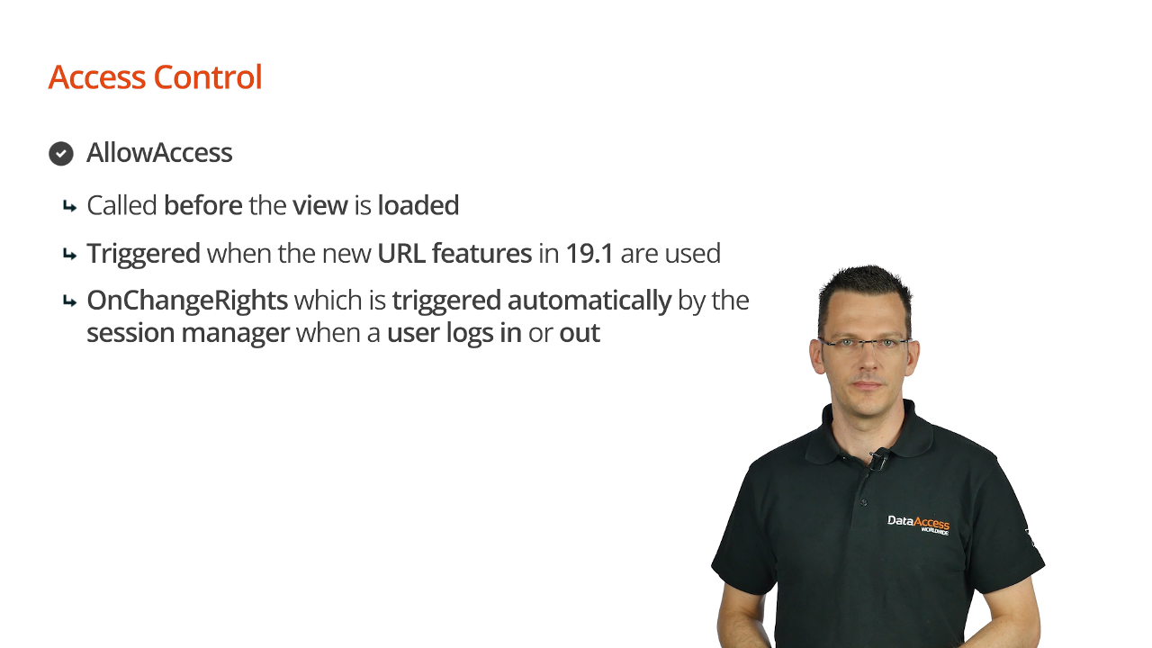 There is one method to check if a user has access to a view called AllowedAccess. AllowedAccess is called before the view is loaded and is triggered when the URL features are used. OnChangeRights is used with the menu and is automatically triggered by the session manager when a user logs in or out.