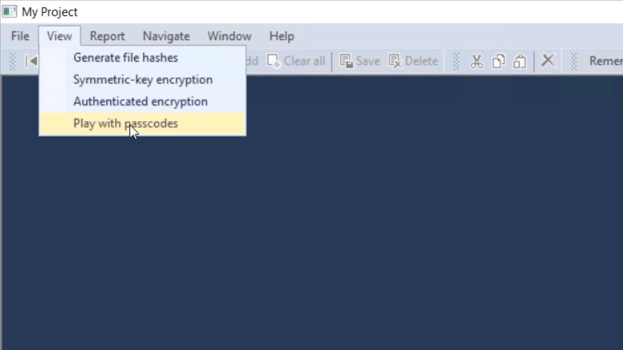 To demonstrate some of this a view called, “Play with passcodes,” has been created in the SecurityBasics project. From the application screen, select VIEW from the top menu and then PLAY WITH PASSCODES.