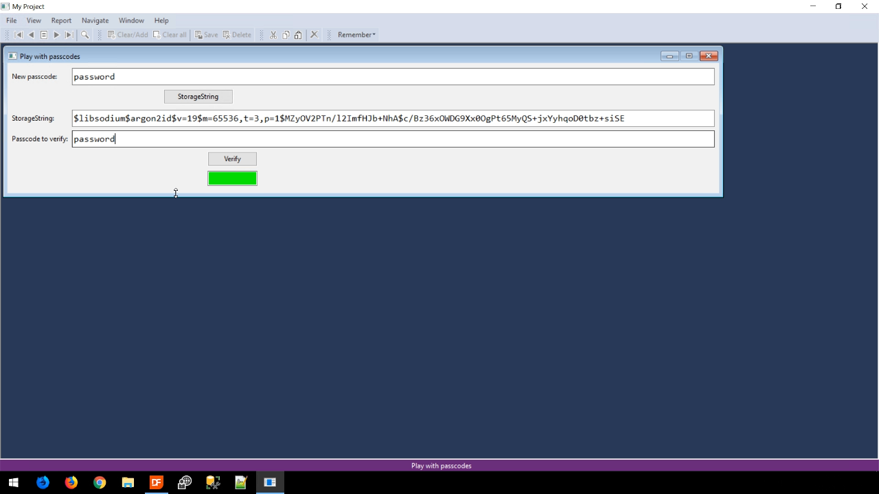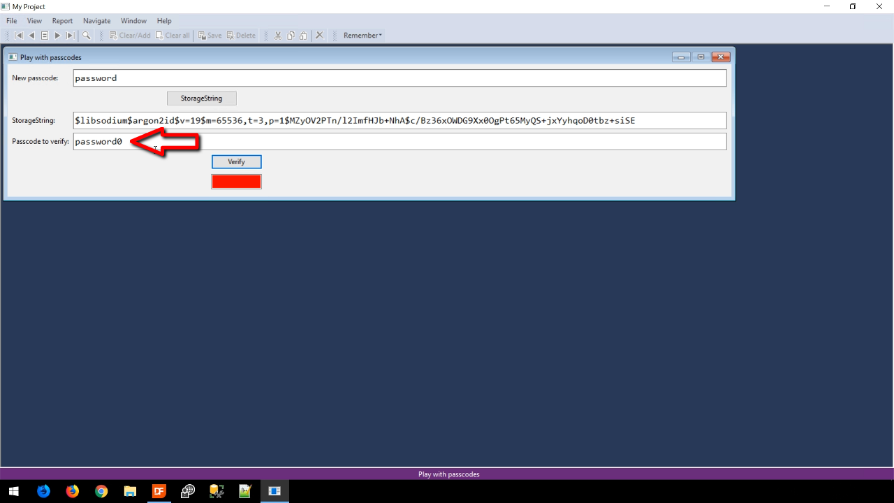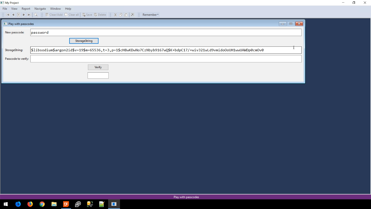 Entering a password into the ‘Password’ field and pressing the STORAGESTRING button (actual method in the security library that can be used) results in a string in the ‘StorageString’ field. The beginning portion of the string shows that libsodium was used as the engine and argon2id is the algorithm. The rest of the string contains some parameters, a salt value, and the resulting hash value.