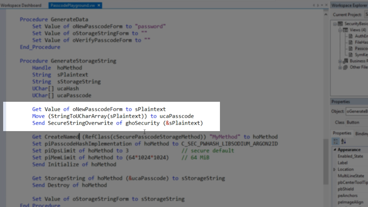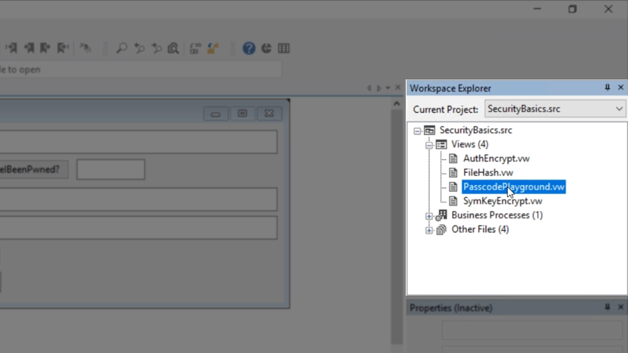 To view the code of how this was done, expand ‘Views’ under ‘SecurityBasics.src’ in the ‘Workspace Explorer’ panel on the right, and select ‘PasscodePlayground.vw.’