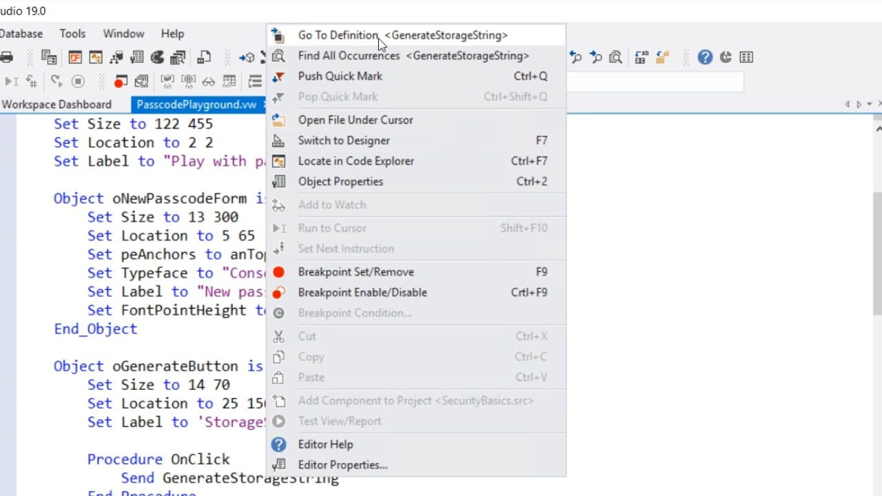 To look at the code for the button, expand ‘oPasscodePlayground’ in the ‘Code Explorer’ panel on the left, and select ‘oGenerateButton.’