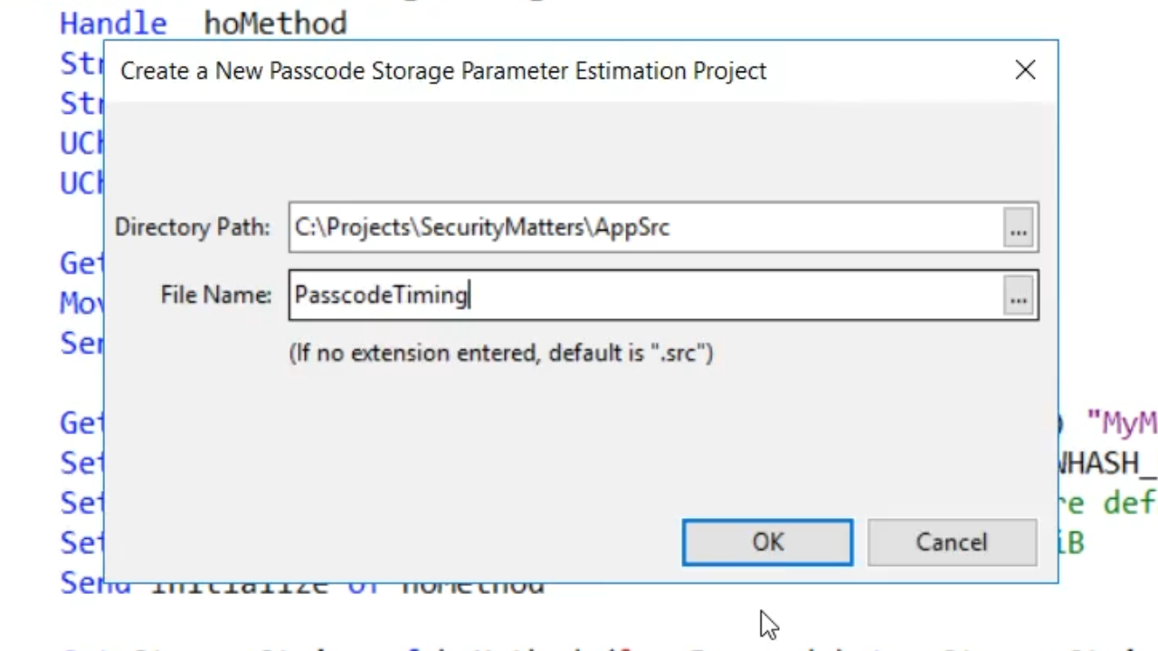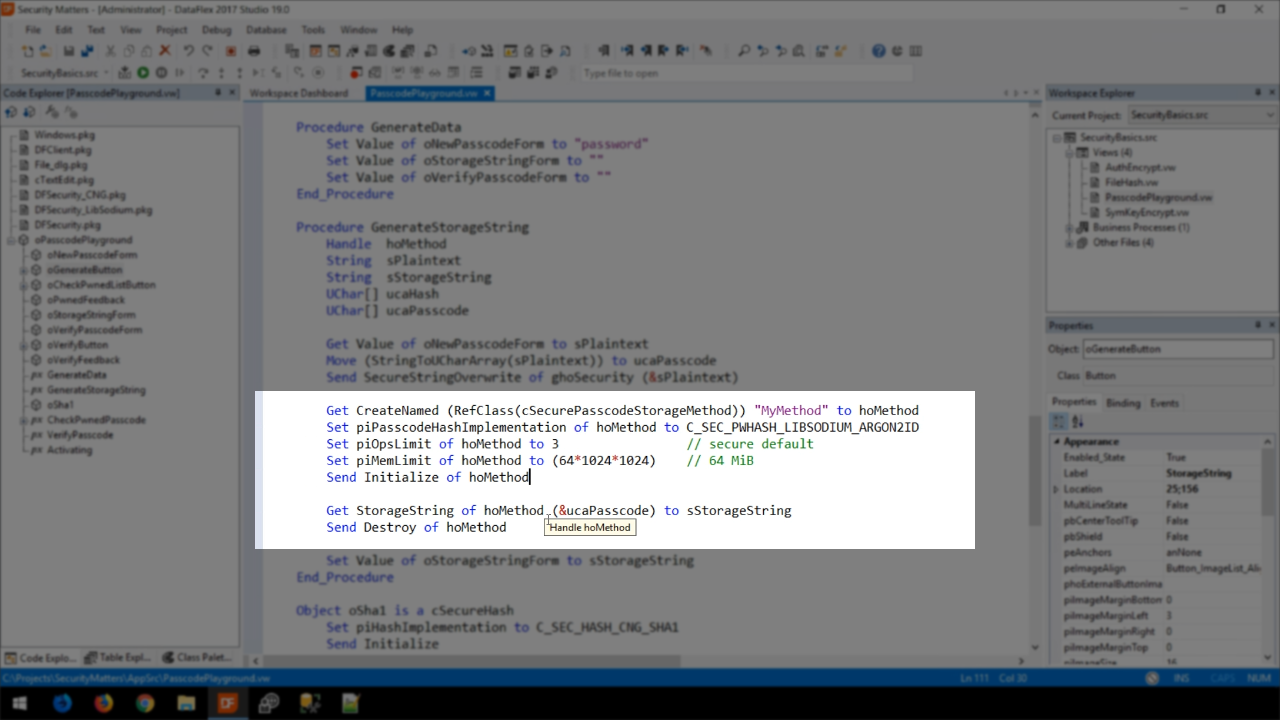 Then a new object is created from the cSecurePasscodeStorageMethod class. Next the piPasscodeHashImplementation is set. In this example, it is set to C_SEC_PWHASH_LIBSODIUM_ARGON2ID. Then the number of operations is set; here it’s set to 3. This is a rather secure default, but different algorithms may require this to be set to a much higher number. The piMemLimit, which is the amount of memory used, is then set. Not all algorithms support this, but Argon2 does. Then the object is initialized. Following all of that, the storage string of the method is retrieved using the uChar array to create the storage string – Get StorageString of hoMethod (&ucaPasscode) to sStorageString.