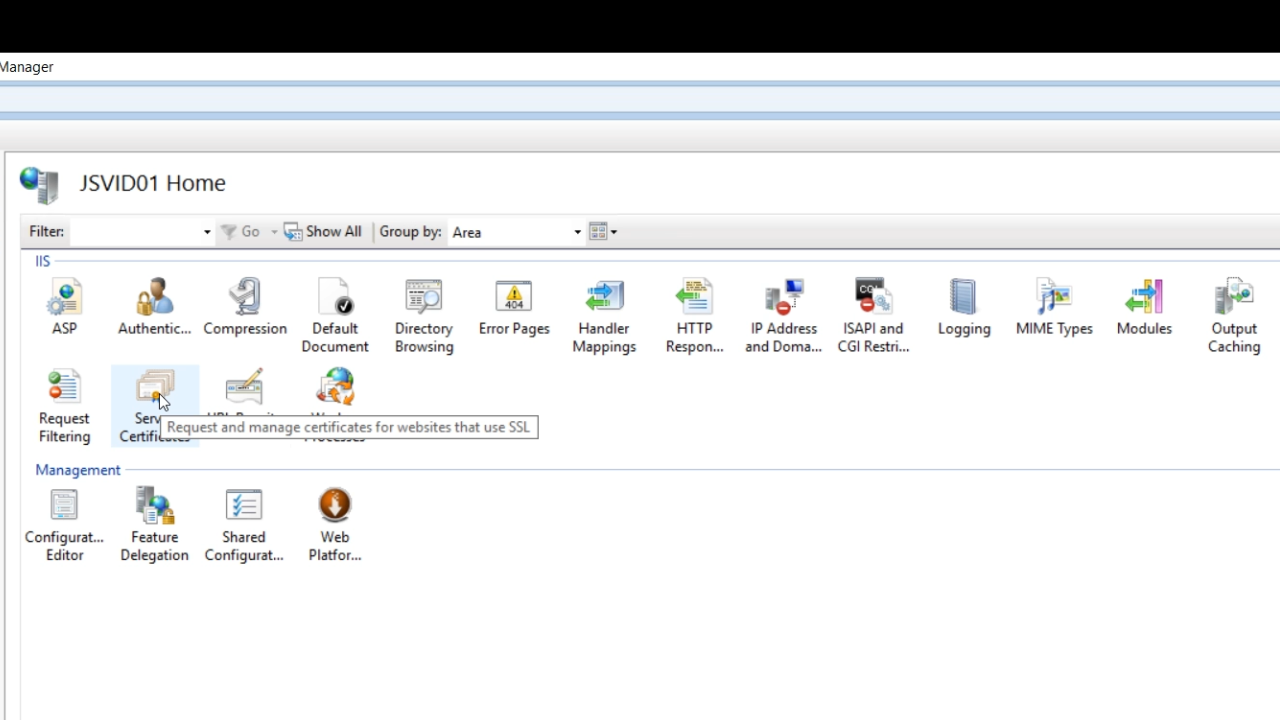 - Select ‘Server Certificates’ from the IIS section in the center.