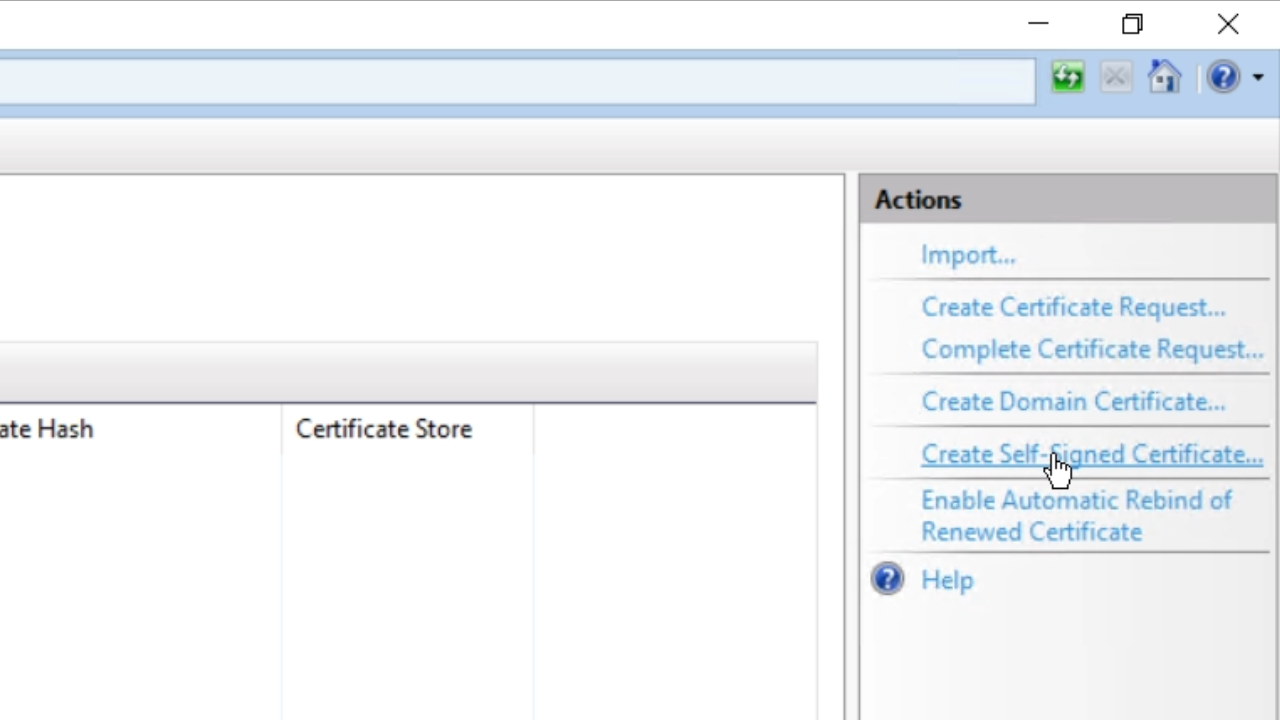 - Click on ‘Create Self-Signed Certificate’ from the ‘Actions’ panel on the right.