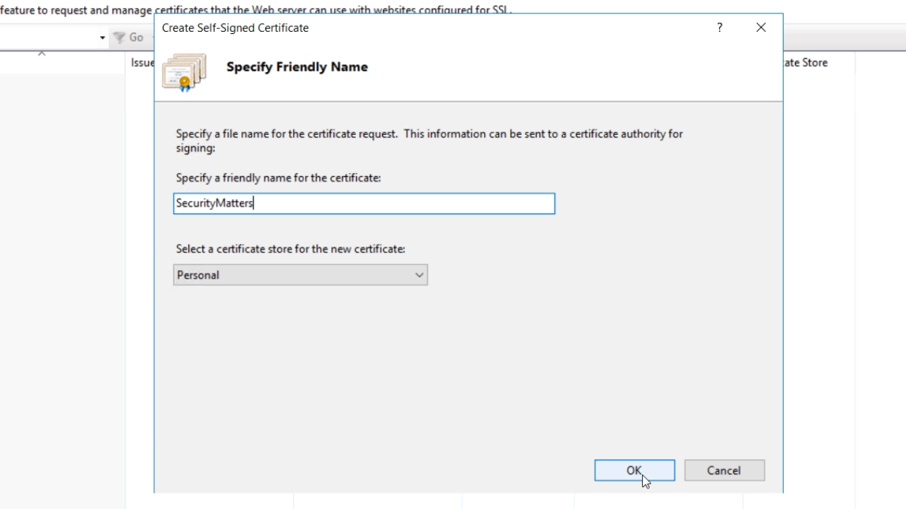 - Enter a name in the ‘Specify a friendly name for the certificate’ field. Press OK.