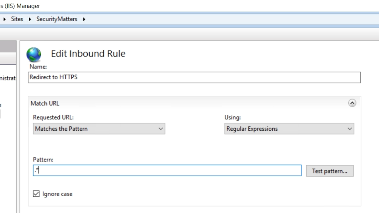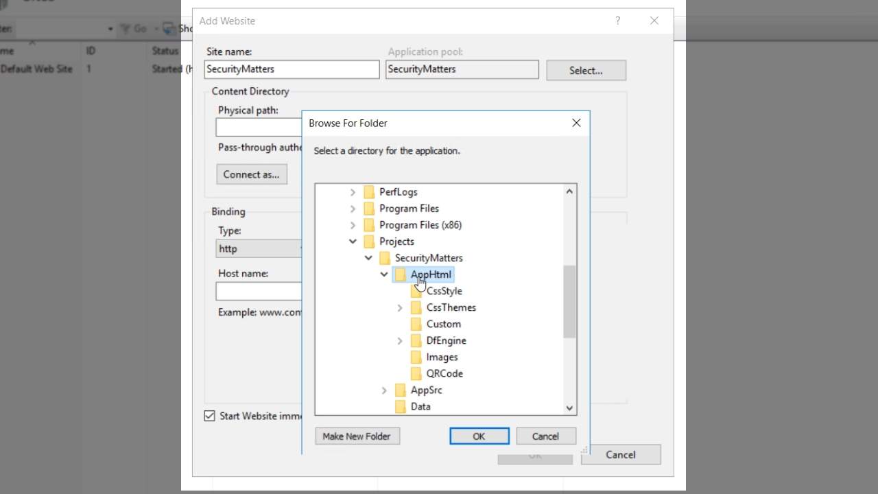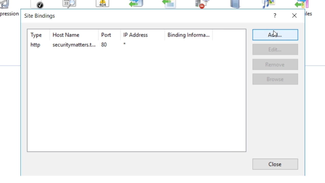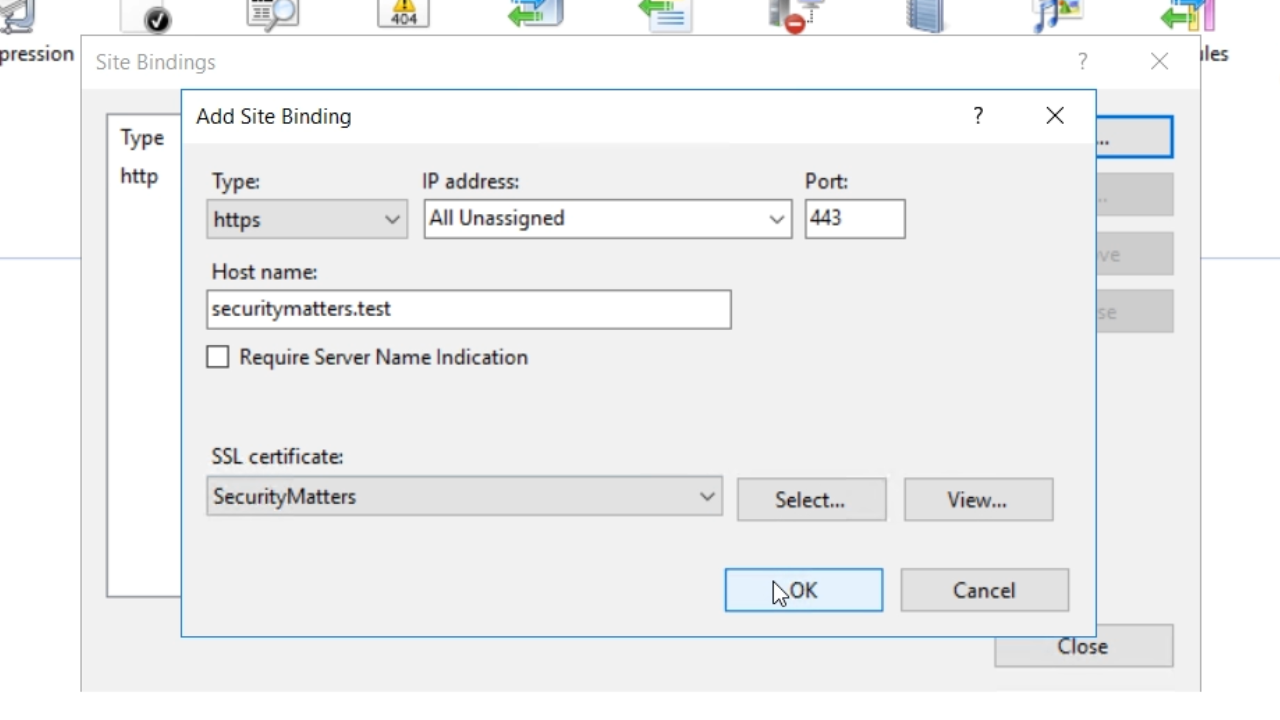 - Create a binding meaning that the website will be available on this particular binding. The first will be ‘http.’ Enter a fake ‘Host name.’ “securitymatters.test” is used in this example. The .test domain extension is unique, and specifically for testing purposes.