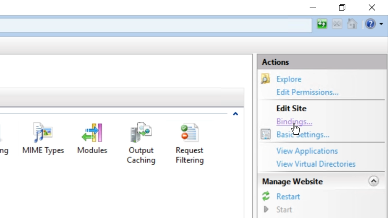 - Select the new website from the ‘Connections’ panel on the left, and then click on ‘Bindings’ in the ‘Action’ panel on the right.