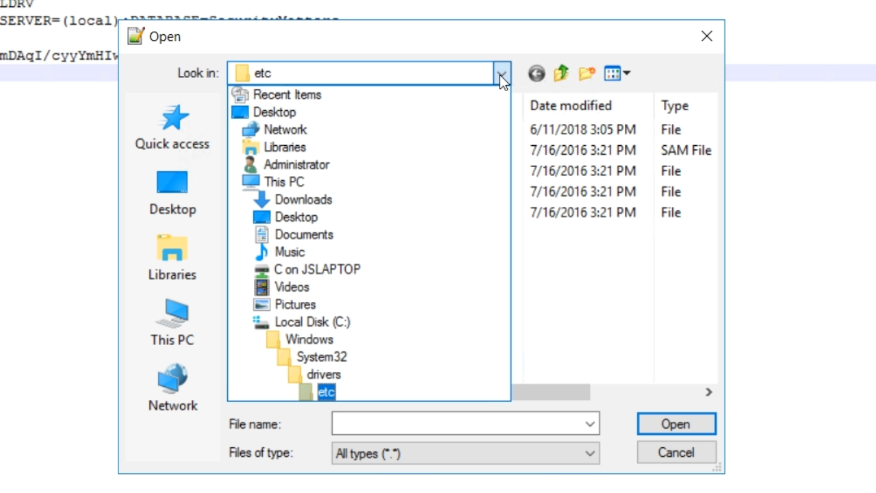 - If the ‘etc’ directory is not visible, enter “etc” in the ‘File name’ field to open it