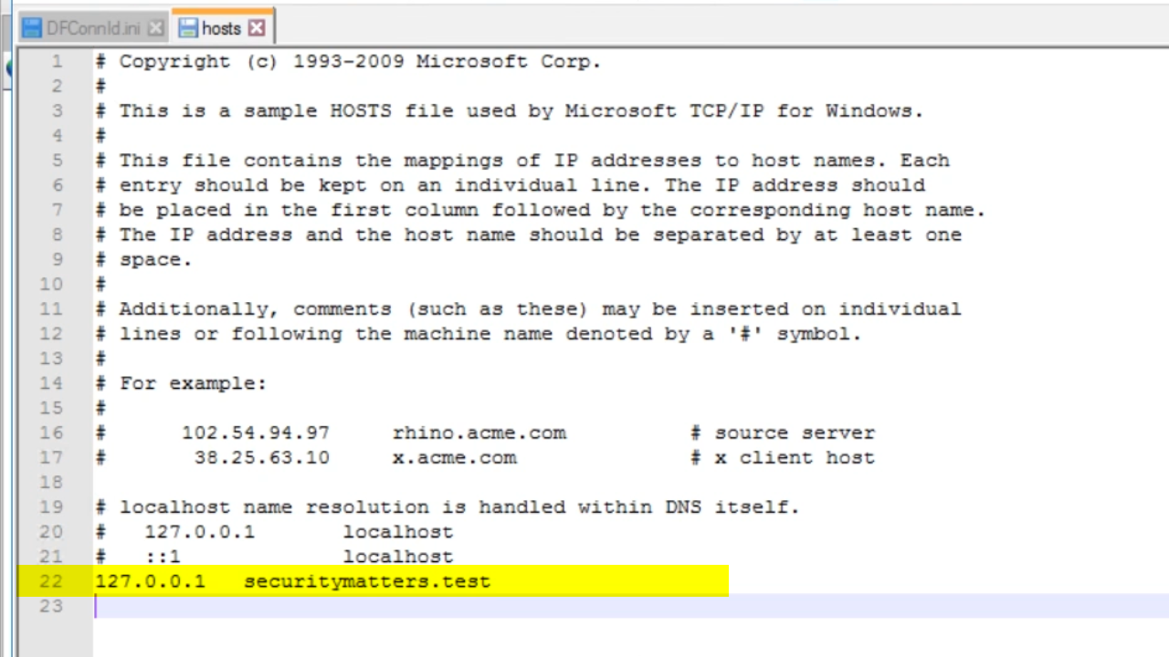 - In the host file, write enter the local IP address, tab over, enter the new URL, (securitymatters.test), and then save the file