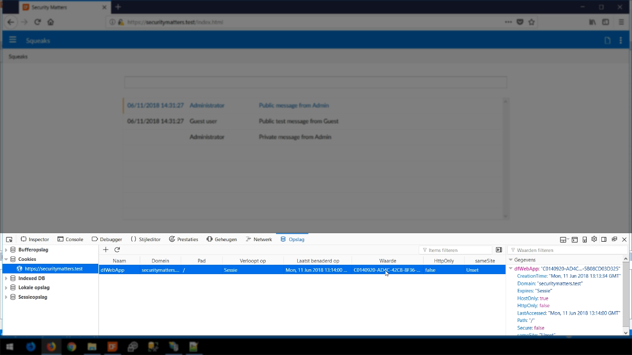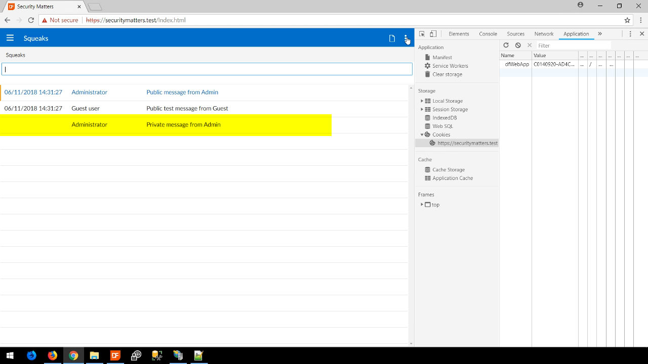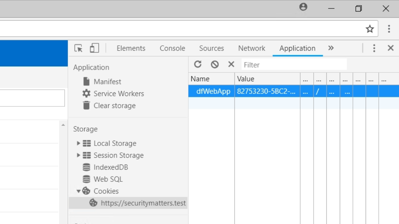 - Pressing F12 opens the development tools panel. A dfWebApp cookie is shown that contains a value of the logged in session.
