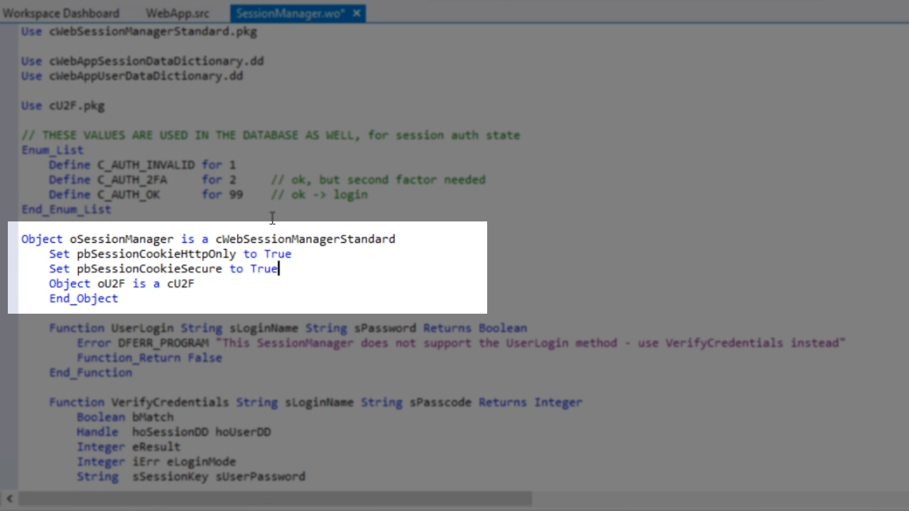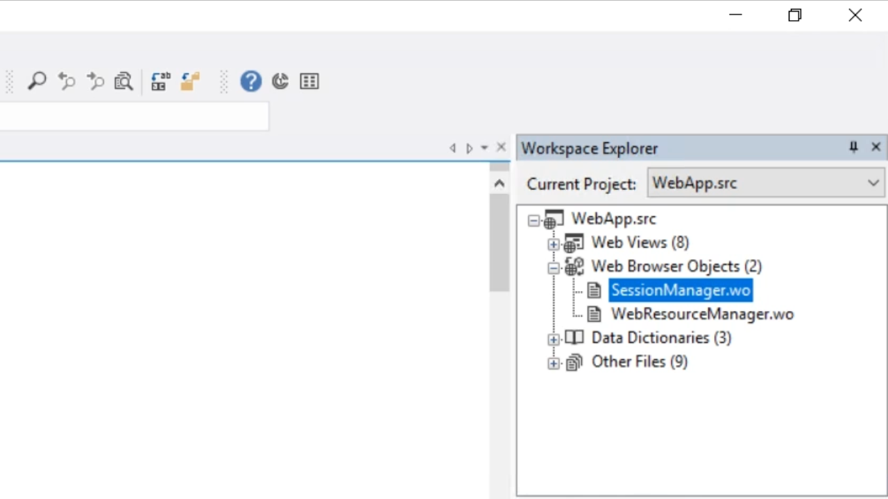 - In the ‘Workspace Explorer’ panel on the right expand ‘WebApp.src,’ and ‘Web Browser Objects,’ and double click on ‘SessionManager.wo’