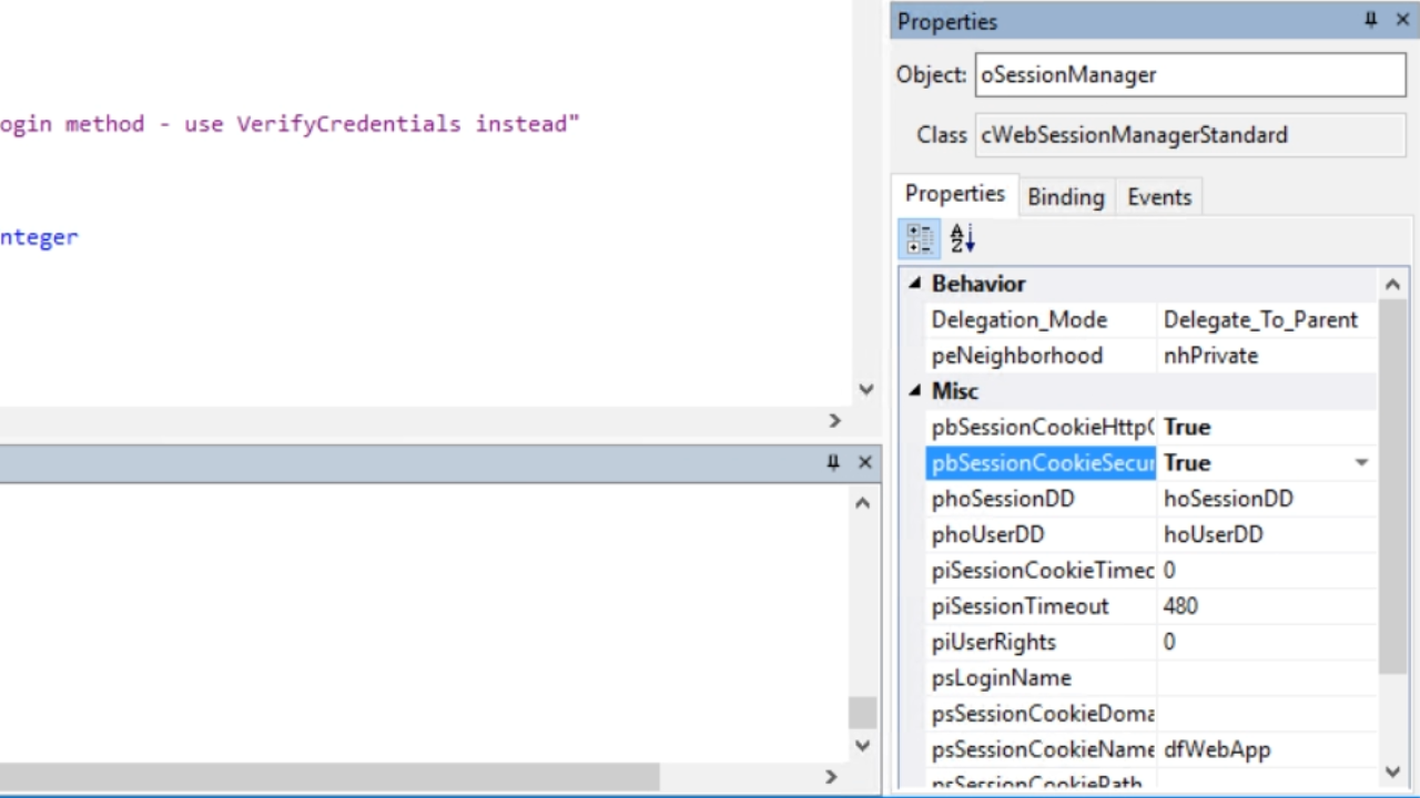 - From the ‘Properties’ tab in the ‘Properties’ panel on the right set ‘pbSessionCookieHttpOnly’ value to ‘True.’ This ensures that the web browser does not expose access to the cookie to JavaScript or any other scripting language.