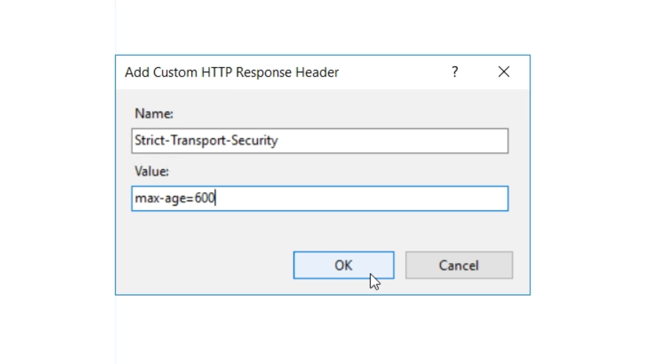 - Name the header. “Strict-Transport-Security” is used in this example.