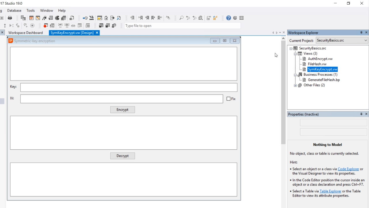 Symmetric key encryption is when the same key is used to encrypt and decrypt data. A view, SymKeyEncrypt.vw, has been created in the SecurityBasics workspace to how symmetric key encryption works.