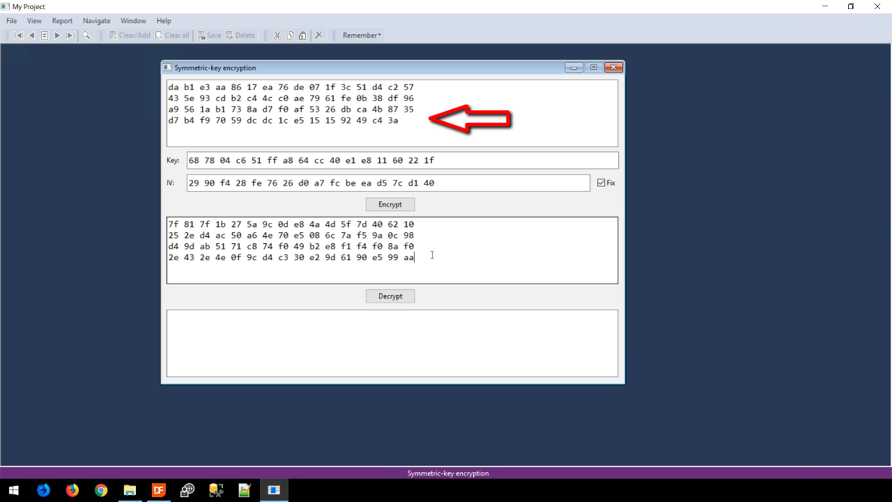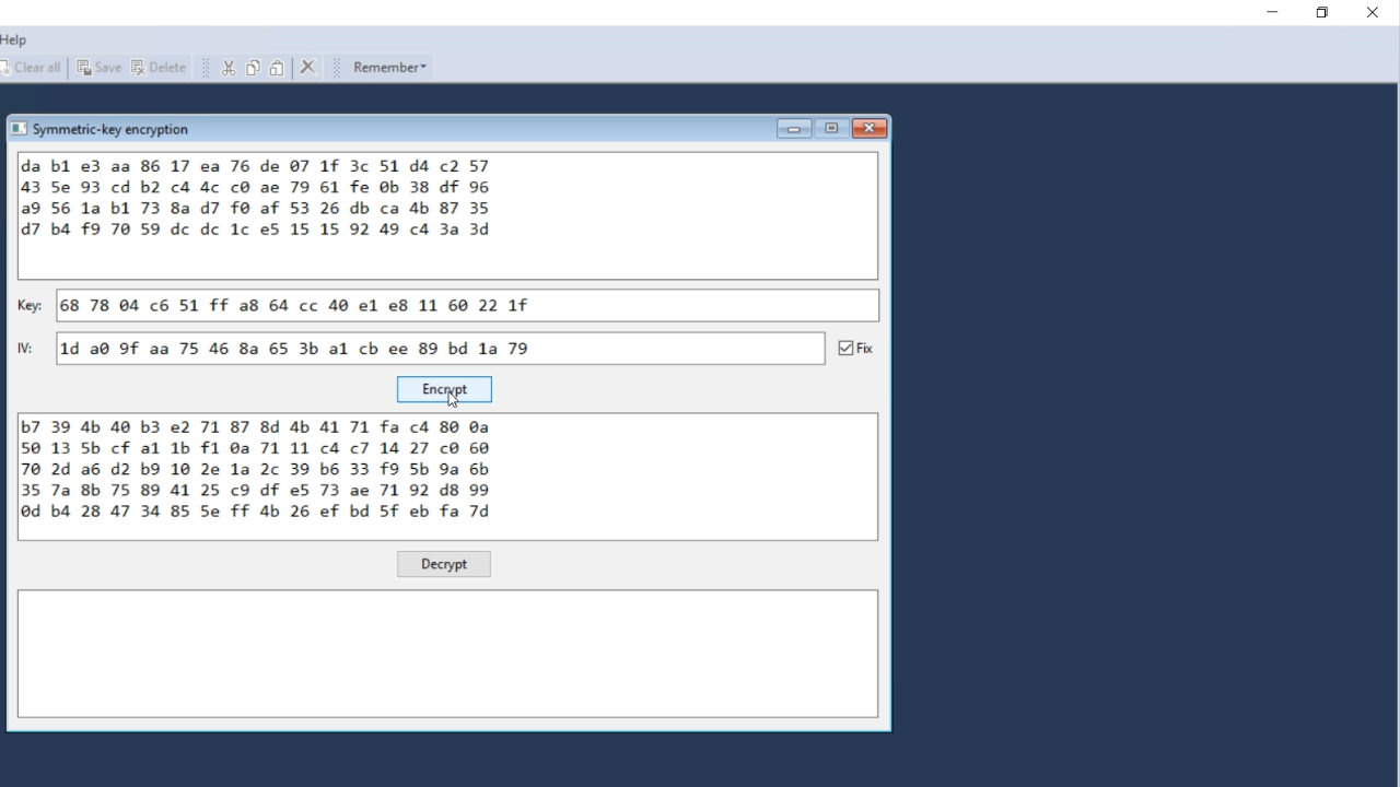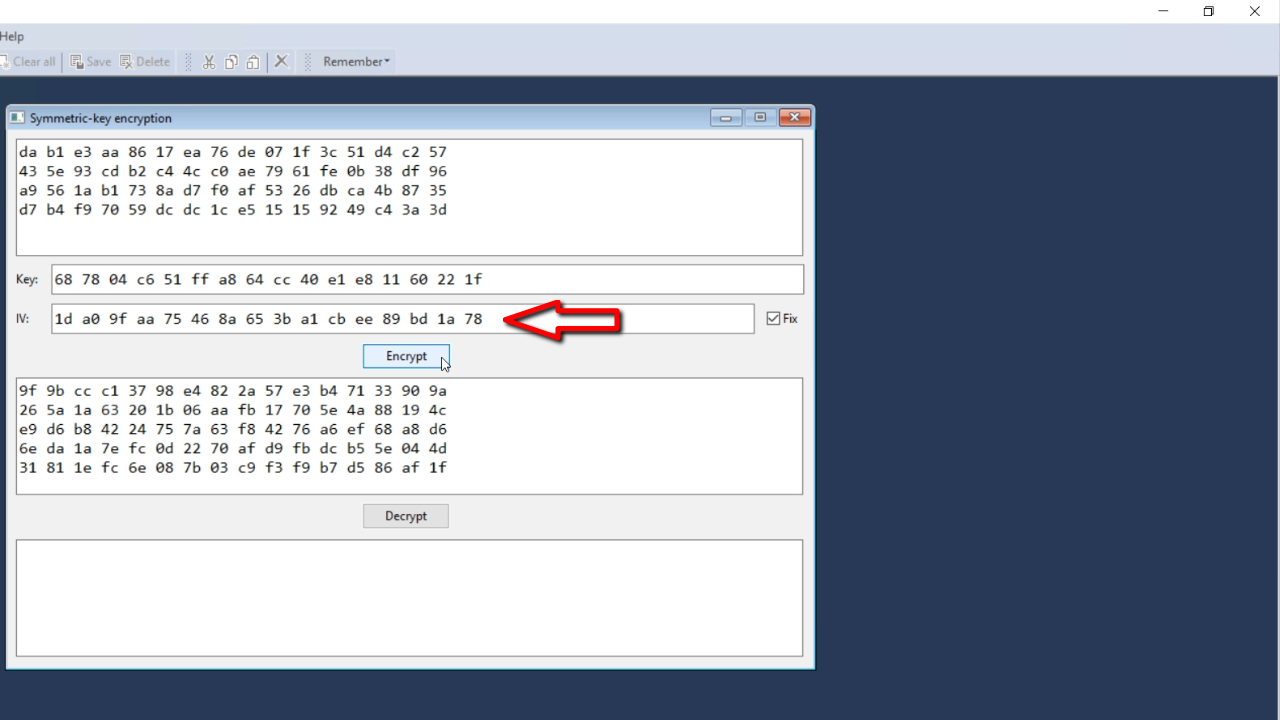 When the ENCRYPT button is pressed the data is encrypted into the middle field. The encrypted data is called sypher text. The original data was just plain text. The Initialization Vector (IV) field was also filled in. If the IV field is fixed (the ‘Fix’ checkbox is marked), the encrypted output will remain the same regardless of how many times the ENCRYPT button is pushed.