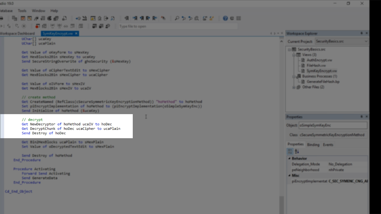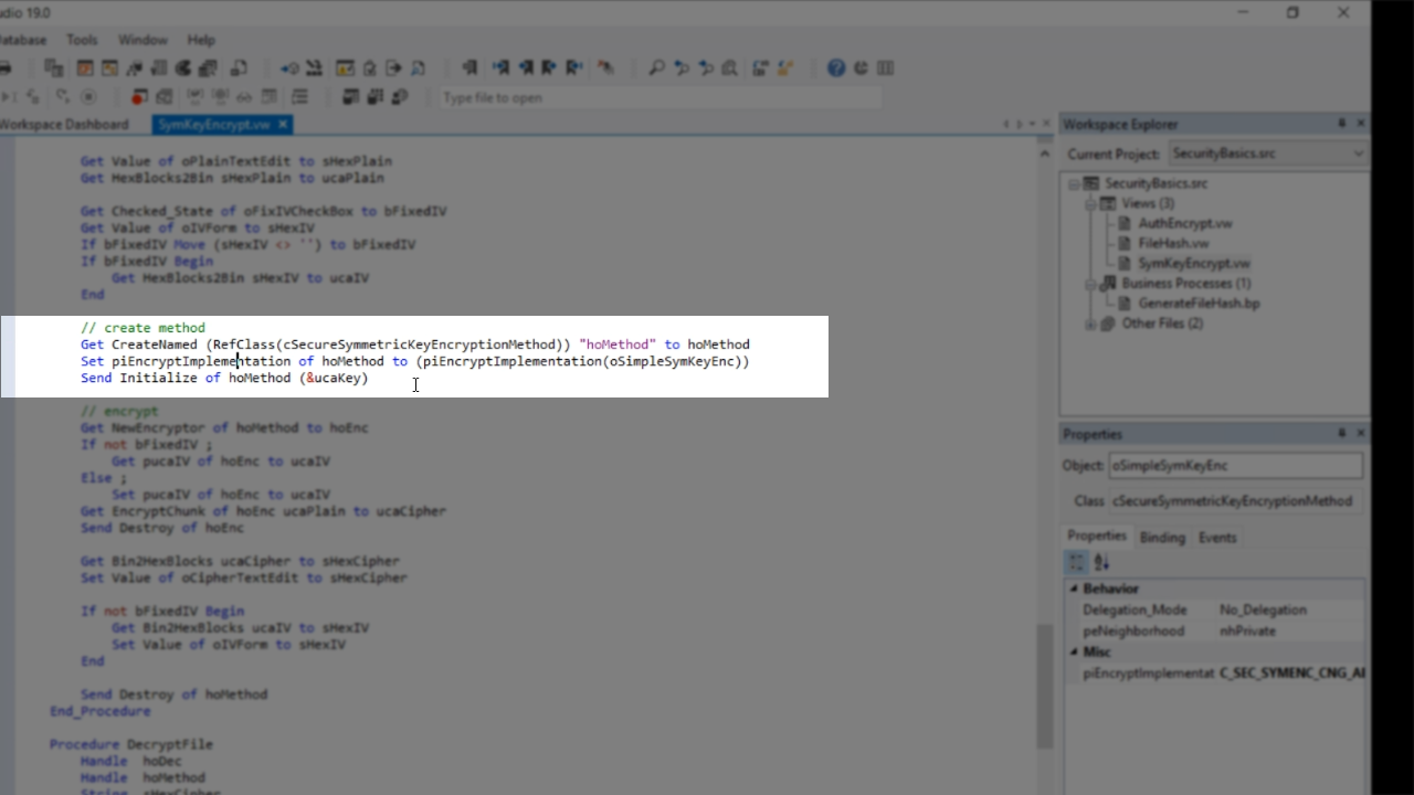 It contains a lot of variables and does several things, but firstly is creates the cSecureSymmetricKeyEncryptionMethod. It is created dynamically in this instance but does not have to be. piEncryptImplementation is set just as it was with the hashes. Initialize is then sent with a unique key