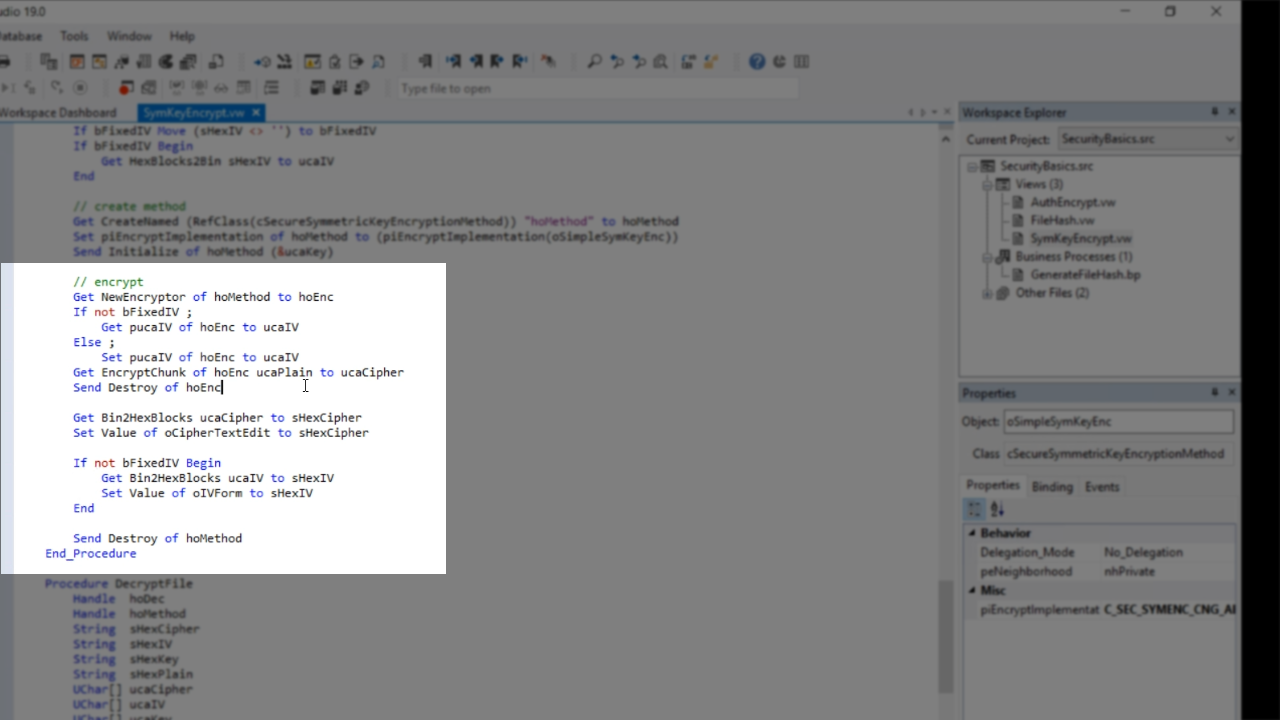 Viewing the code to further understand this, stop the debugger, and click on ‘oSymKeyEncrypte> oSimpleSymKeyEnc’ in the ‘Code Explorer’ on the left to view the encrypt file method.