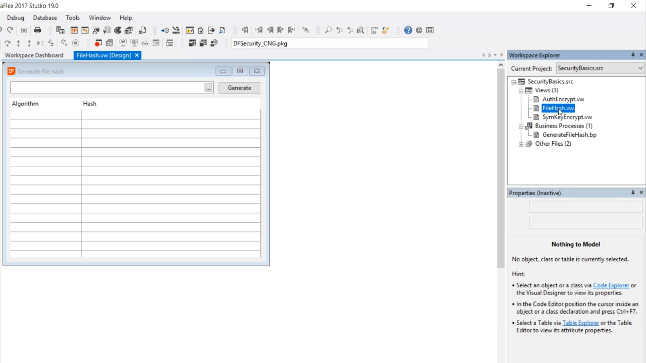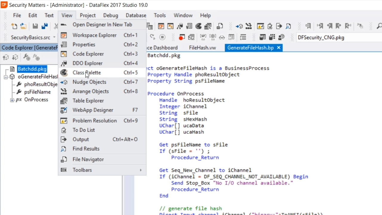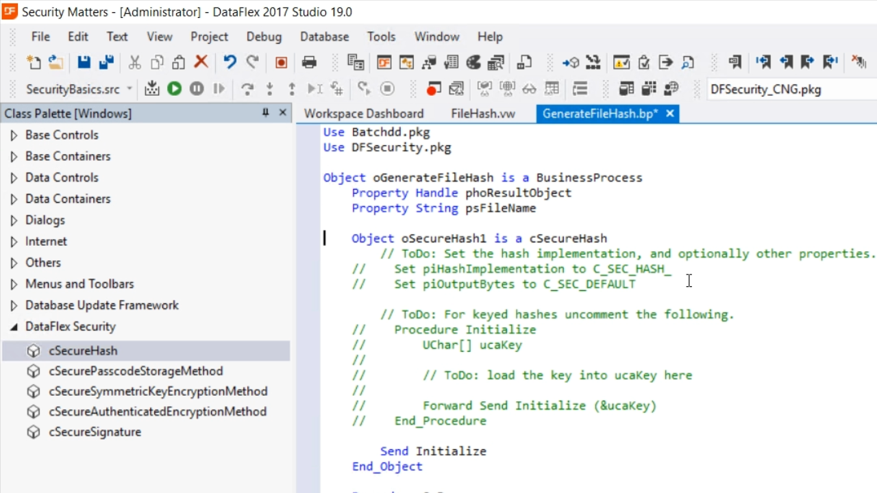 - Then, from the palette panel on the left, expand ‘DataFlex Security,’ and drag-and-drop ‘cSecureHash’ into the code.