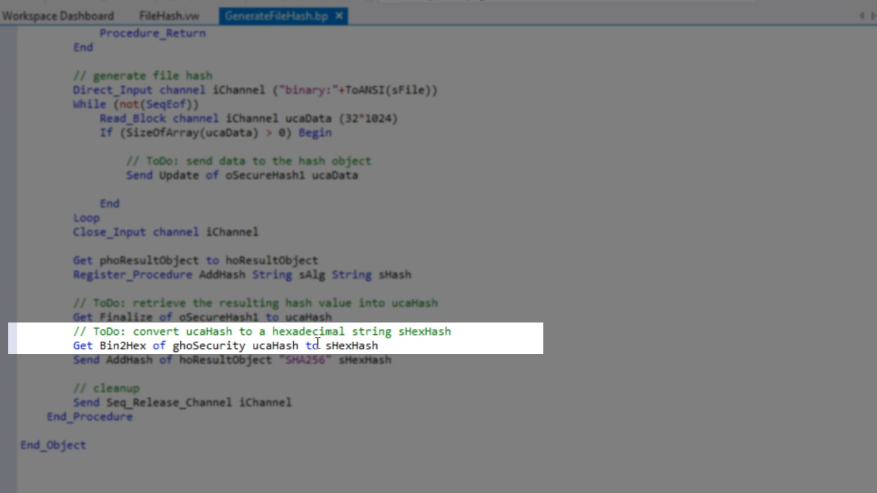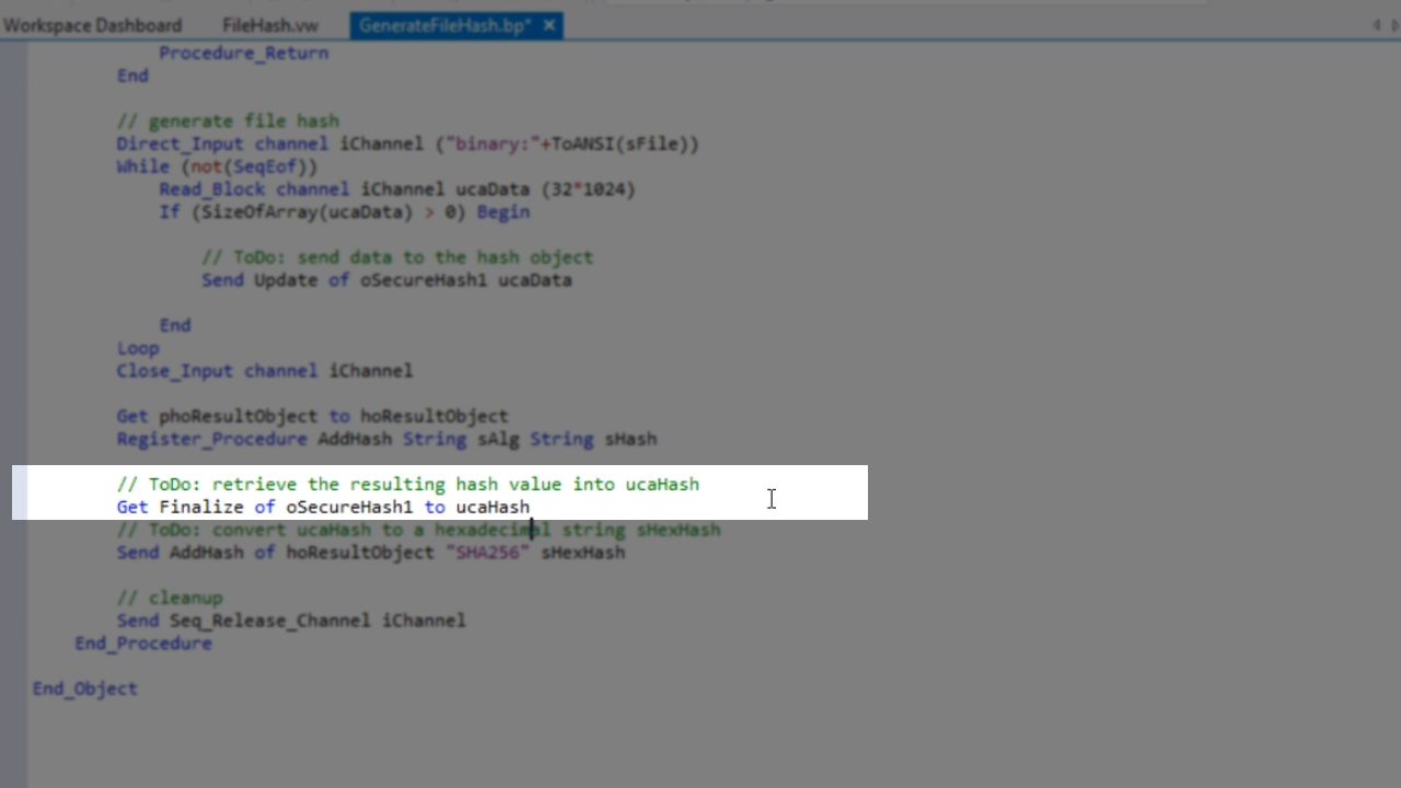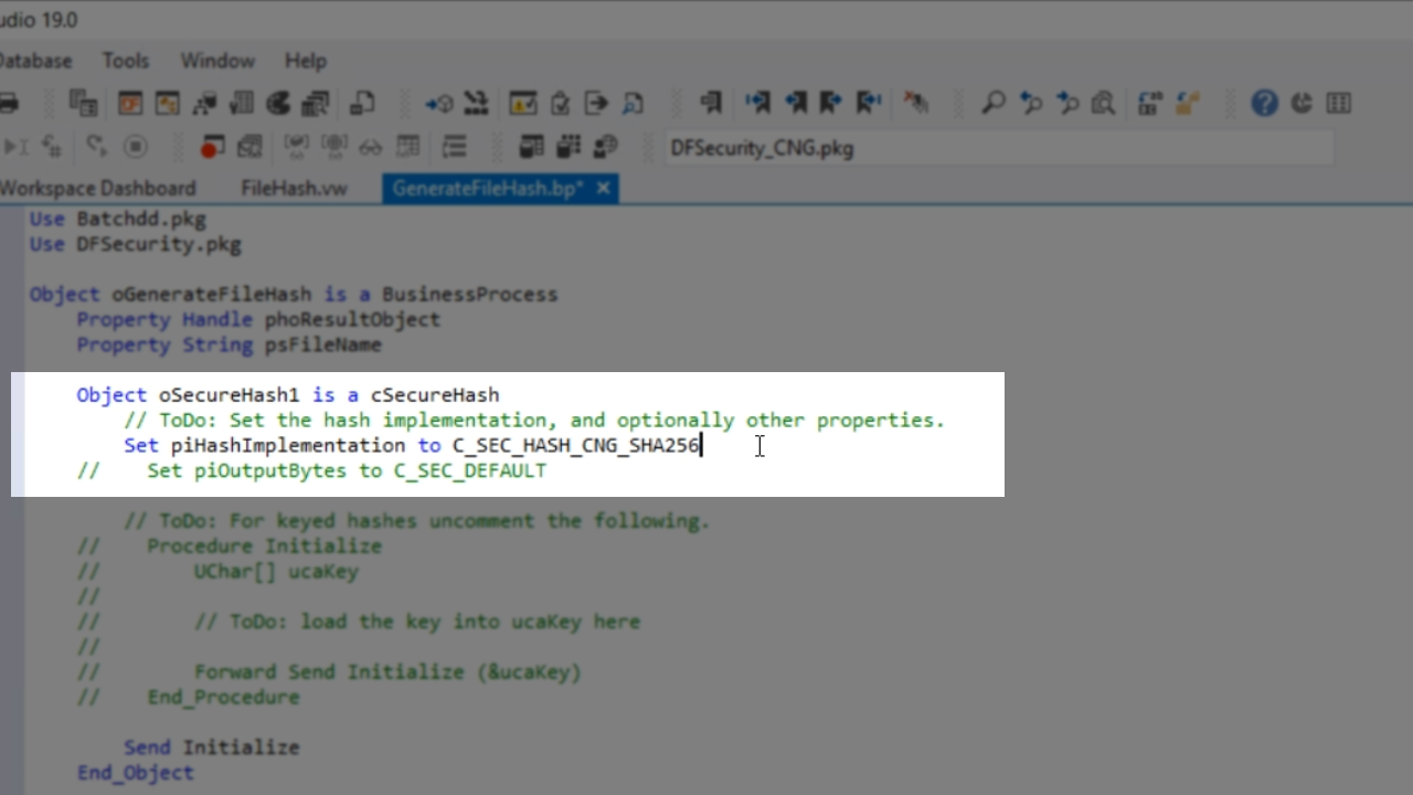 - The first ToDo in the template is to set piHashImplementation. A very simple one is used for this example, C_SEC_HASH_CNG_SHA256. This is standard in Windows, so it is the easiest. Copy the name of the object – cSecureHash1.