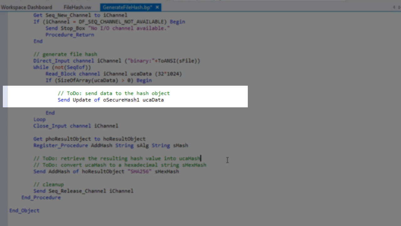- Further down in the code, the data will need to be sent to the hash object. The hash object will process all the data sent to it and will then generate a fixed sized hash. To do so, the following is added to the code…