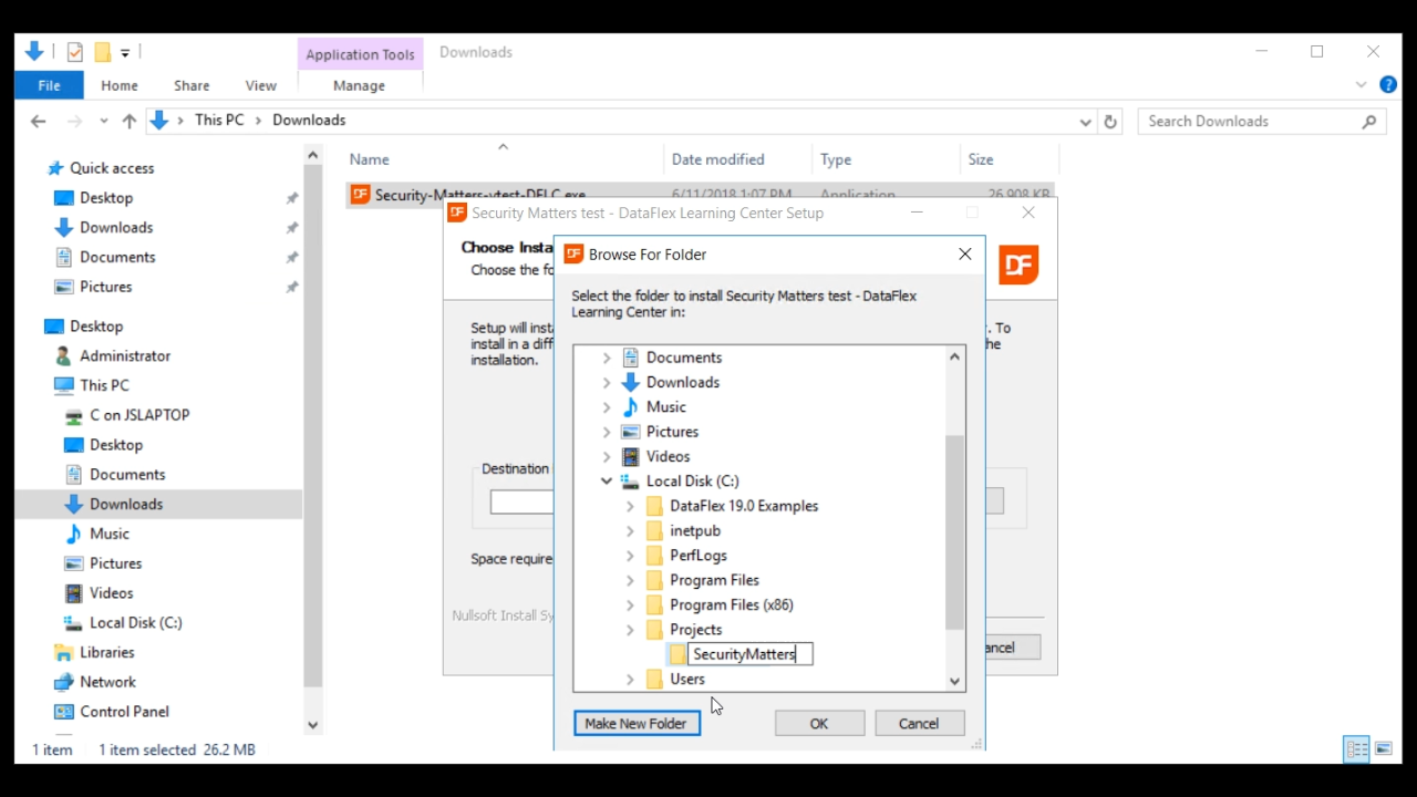 An .exe file is double clicked from the Downloads folder causing an installation wizard to be launched. All the defaults within the wizard can be accepted. A destination folder does need to be defined. A new folder called “SecurityMatters” is created within the “Projects” directory.