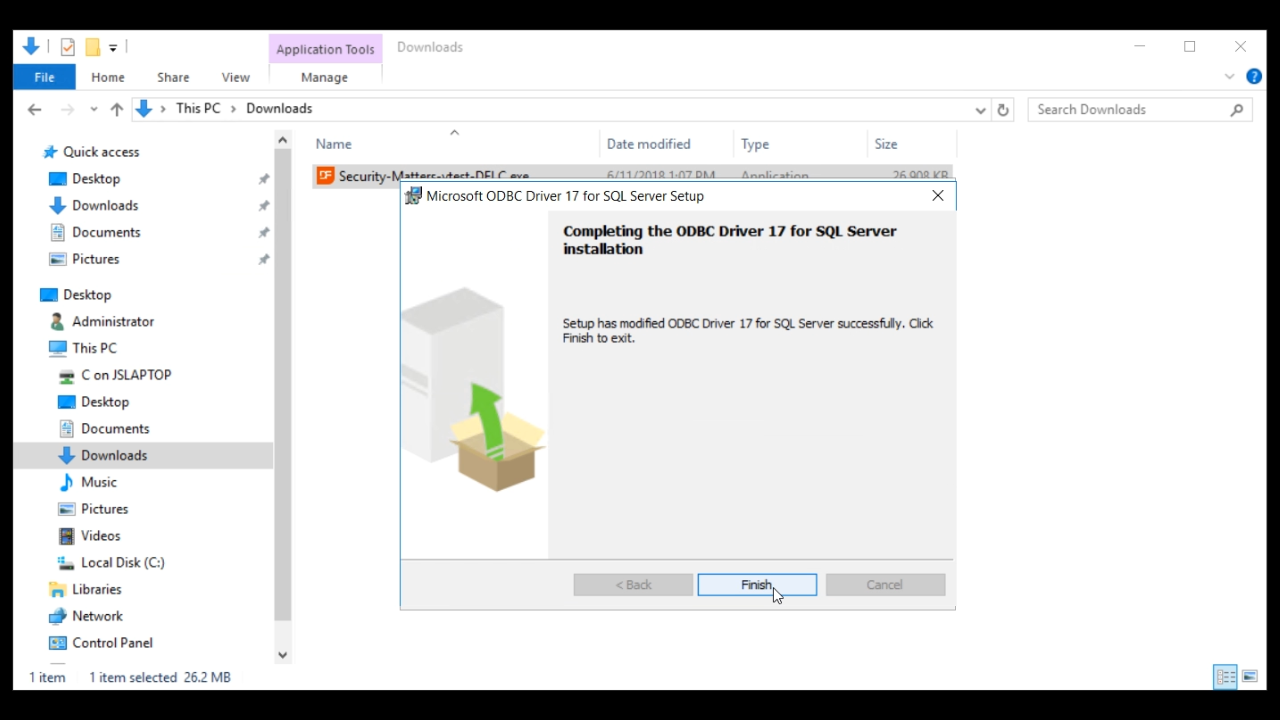 The ODBC Driver for the SQL Server will also need to be installed. Select NEXT three times to accept the defaults, and finally INSTALL and FINISH to complete its installation.