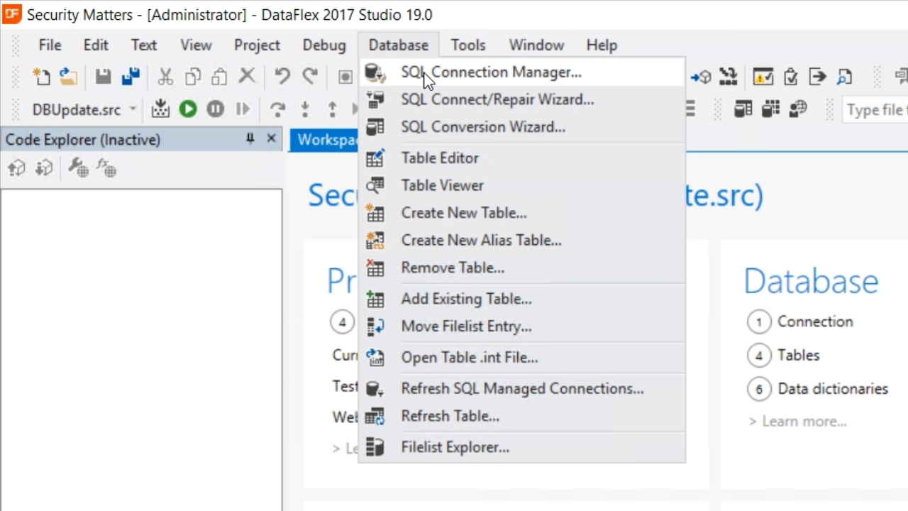 Next, double click the project, ‘DBUpdate.src,’ from the Workspace Explorer on the right to open it. This program will create the entire database structure and enter some dummy data into it.