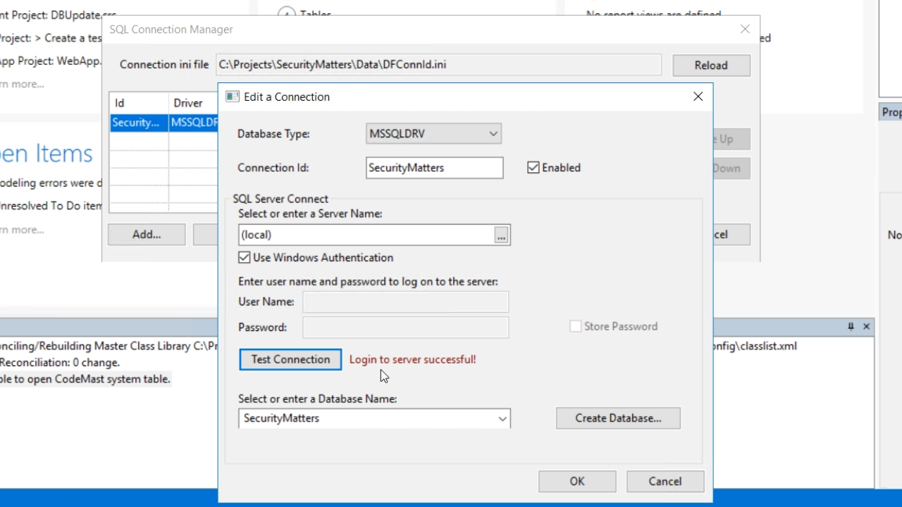 The default connection is shown even though it has not yet connected. Select the EDIT button. The ‘Connection Id’ and the ‘Select or enter a Server Name’ are correct for this example. ‘Use Windows Authentication’ needs to be checked. At this point, there is no database. Select the ‘Create Database’ button and enter a name in the following popup. “SecurityMatters” is used for this example. Select the ‘Test Connection’ button, and the message “Login to server successful!” should appear. Select OK, and then SAVE.