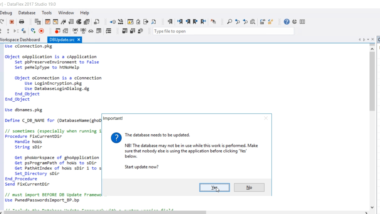 Press F5 to run it. A popup will appear stating that the database needs to be updated. Select YES. Select OK at the end to finish. Now there is an installed workspace with a connected database.