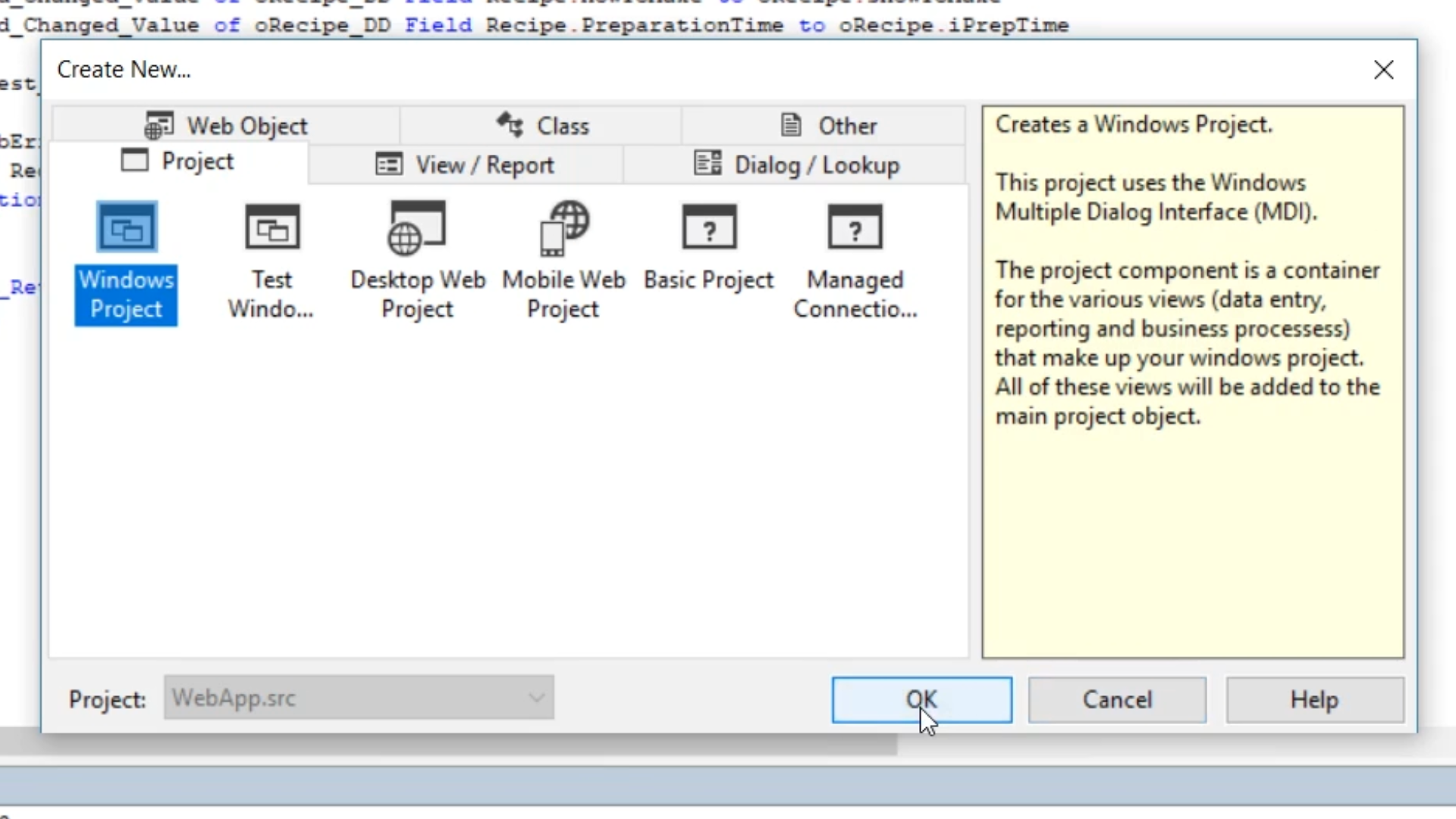 - From the DataFlex Studio select FILE > NEW > PROJECT > WINDOWS PROJECT. Select OK.