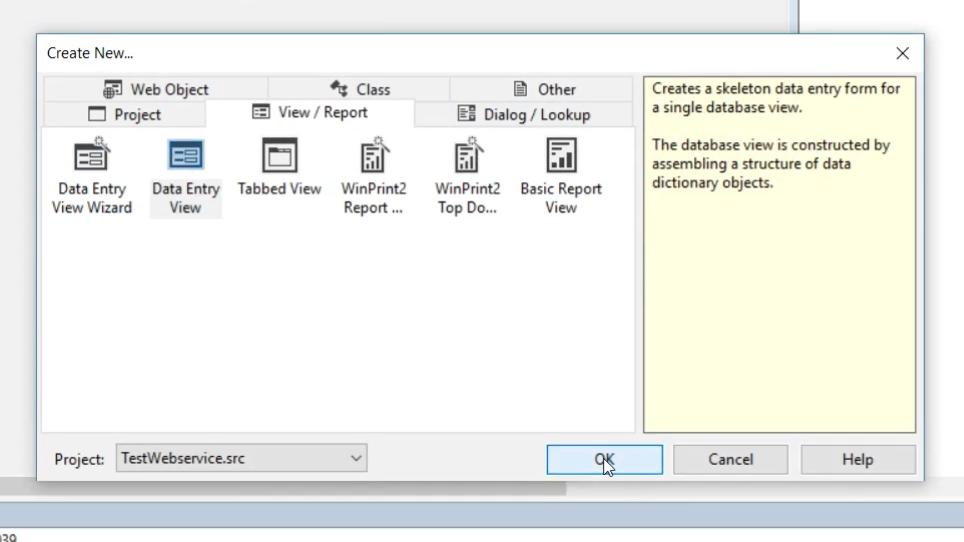 - Select FILE > NEW > VIEW/REPORT > DATA ENTRY VIEW. Select OK.