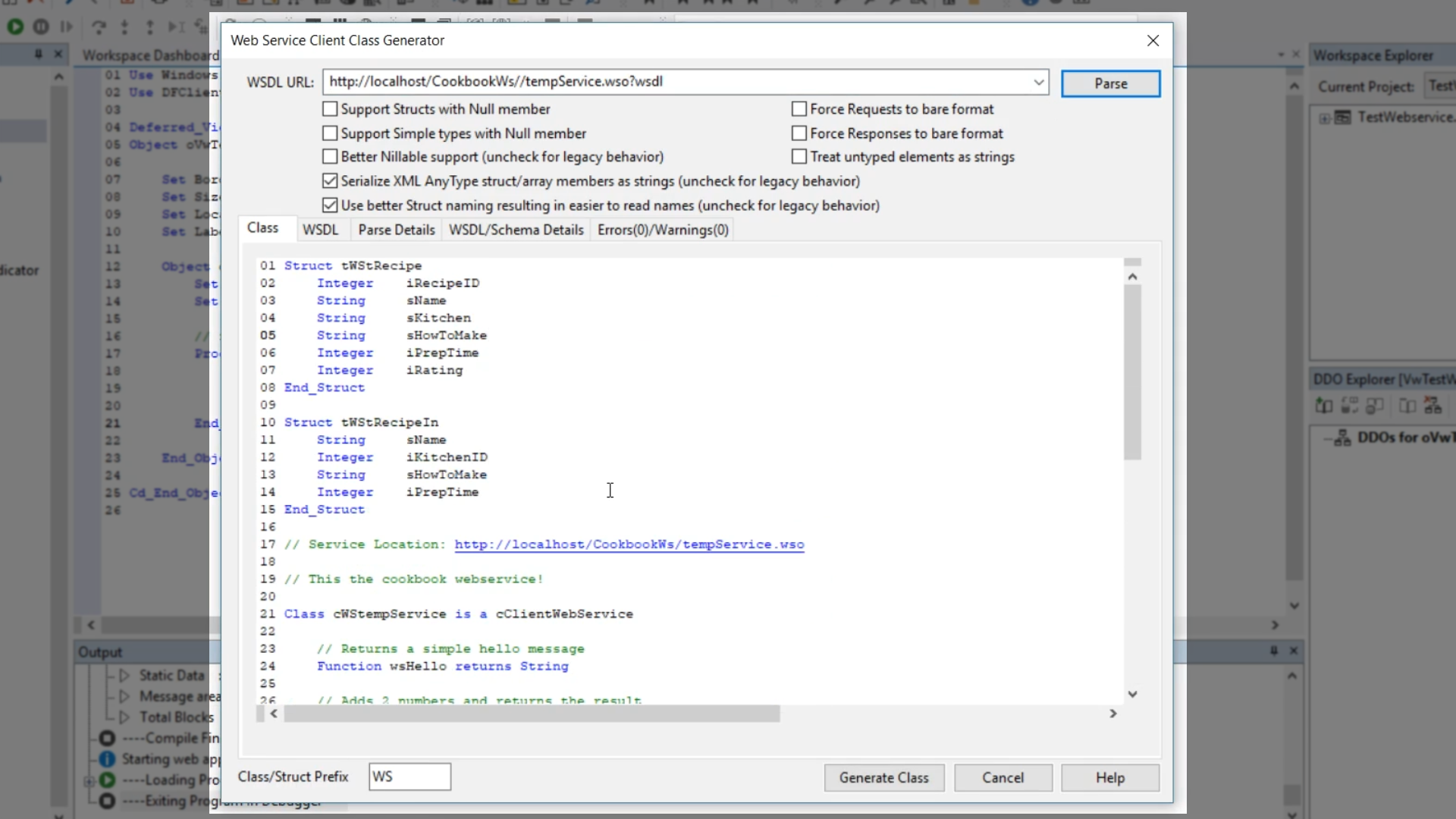 - Select GENERATE CLASS, enter “cWSCookbookWebService” into the ‘Class Name’ field, and select OK.