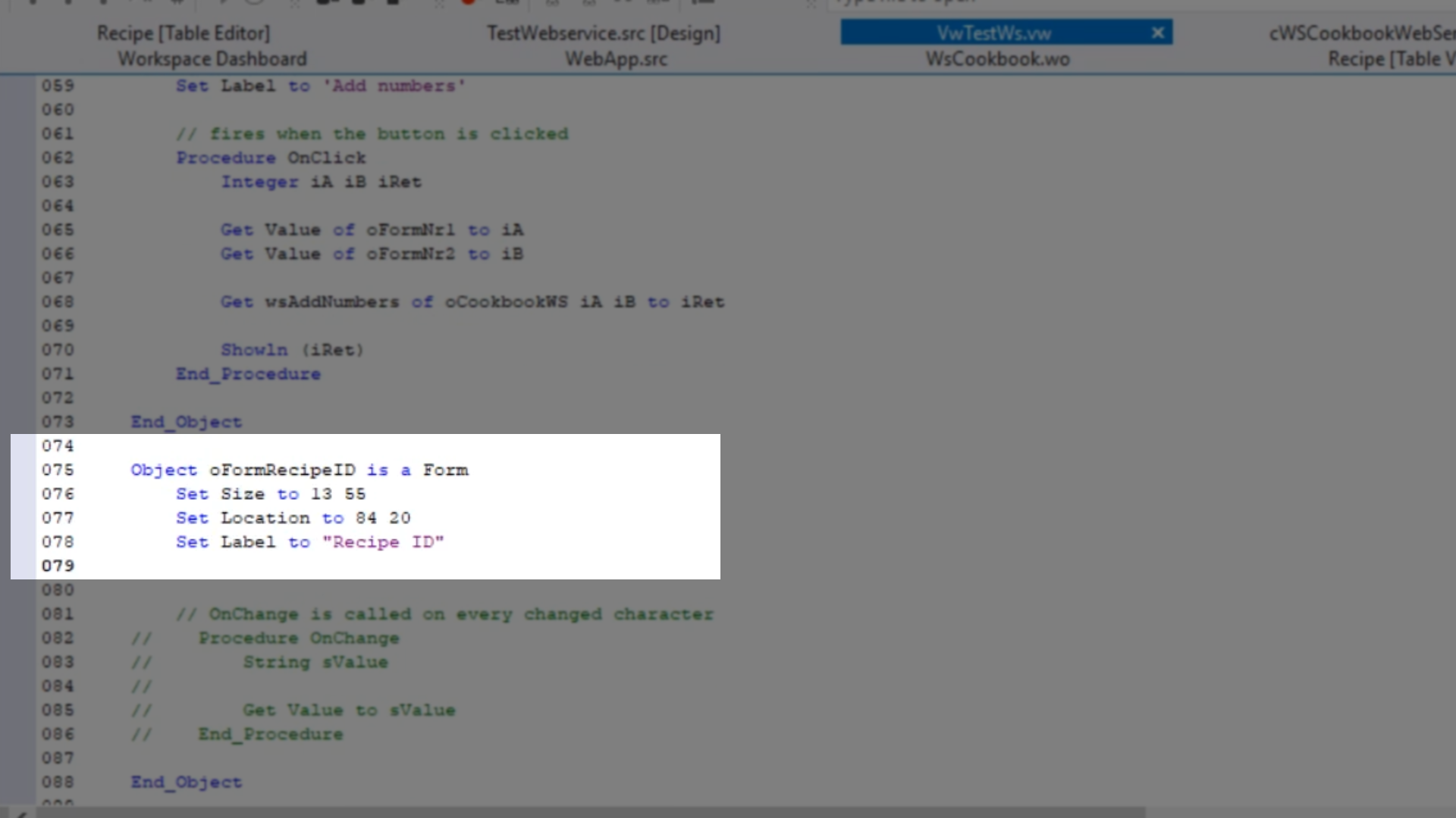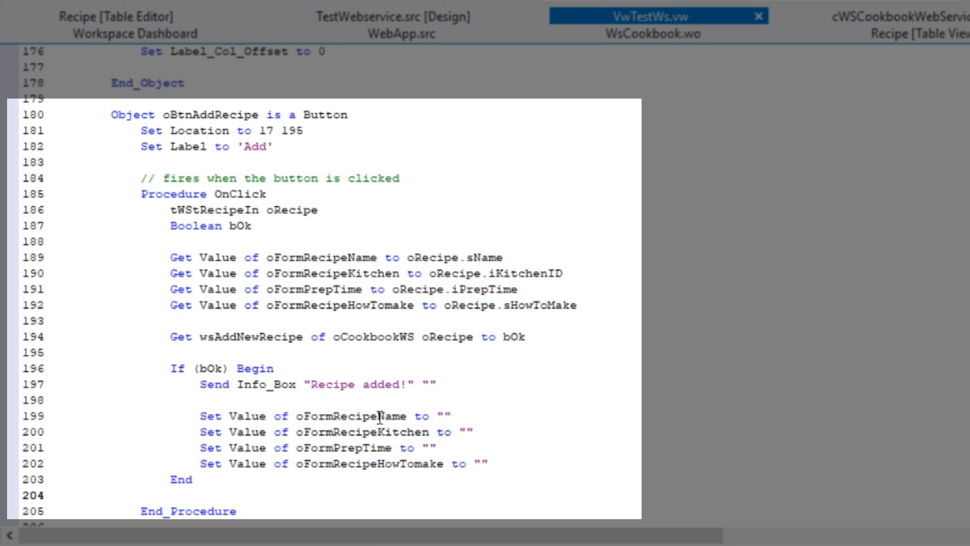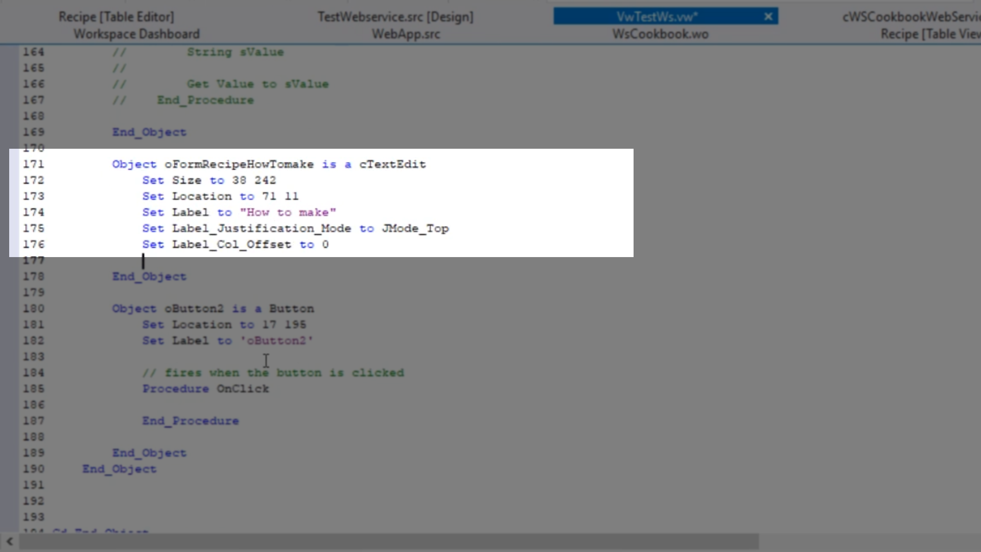 - Returning to the DataFlex Studio, select the ‘cWSCookbookWebService.pkg’ tab.