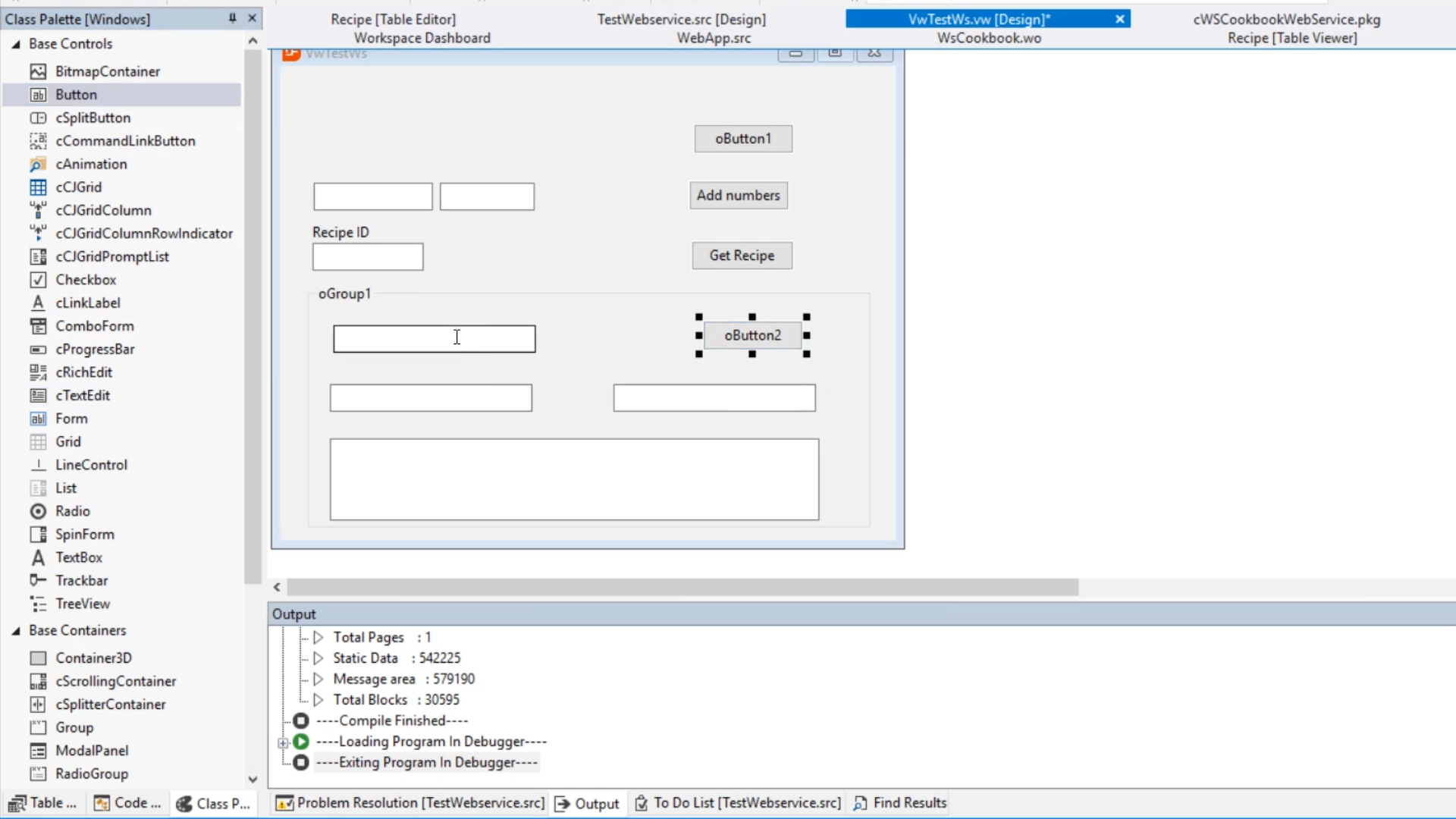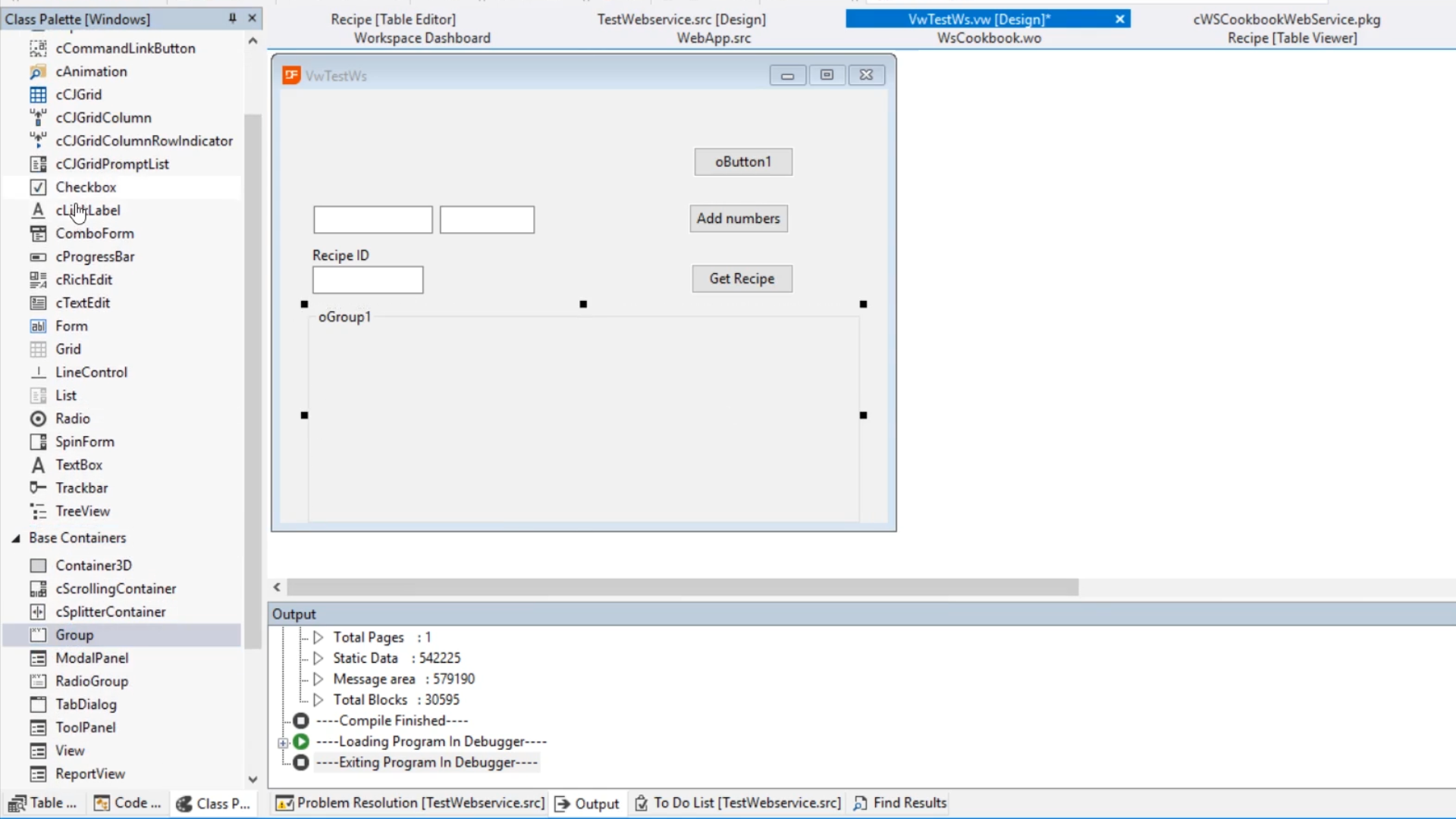 - From VwTestWs.vw [Design] add a group to the design of the program by expanding ‘Base Containers’ in the Class_Palette panel, clicking on ‘Group’ and dragging and dropping the group onto the view.