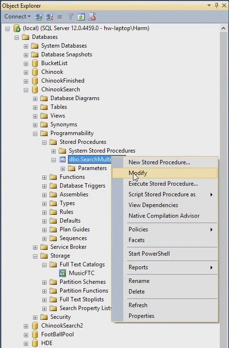 - On the left side expand the ‘Programmability’ which has stored procedures. Find the ‘dno.SearchMultiTable’ stored procedure.