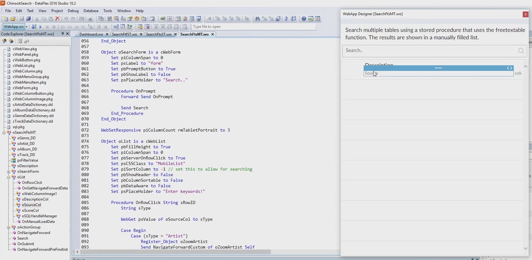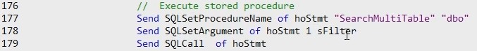 - There are different columns, it has description and source. Also, the ‘OnManualLoadData’ now doesn’t have a query in it, but it’s going to execute the stored procedure. In DataFlex you can do this by doing a ‘SendSQLSetProcedureName’ and then ‘Send SQLSetArgument’. In this case set the first argument to the filter text. Encoding here is not needed because the ‘SQLSetArgument’ automatically makes sure that you cannot use a SQL injection to hack into the database. A SQLCall executes the stored procedure.