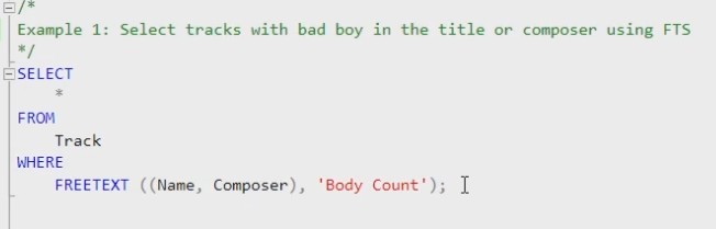 To use this within a query, simply use the FREETEXTFILTER in the ‘where’ class. The FREETEXTFILTER is being used to search for body count on the name and composer.
