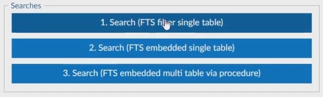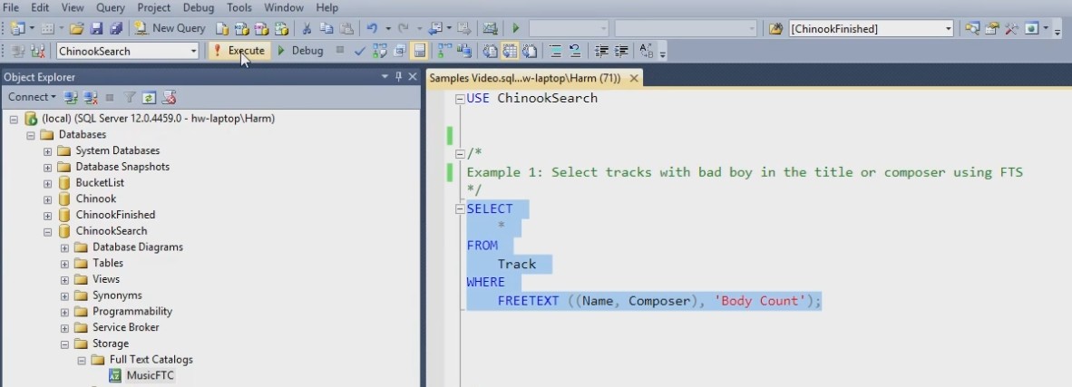 In the SQL manager you can see we are using the Chinook search database, in this database there is a full text catalogue that indexes the several fields of the database.