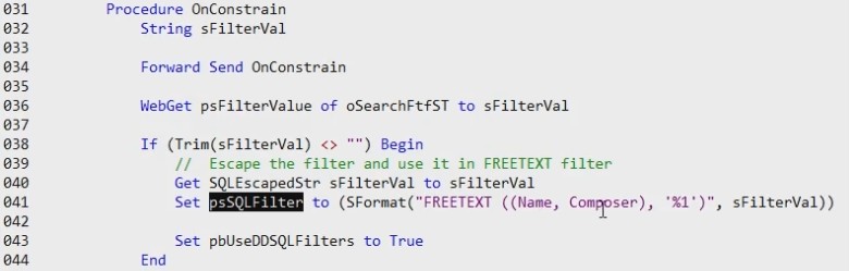 Here is the ‘OnConstrain’ procedure that constrains the data by setting a ‘psSQLFilter’ and the psSQLFilter is just generated as a string, so here you can see the free text filtering on name and composer.