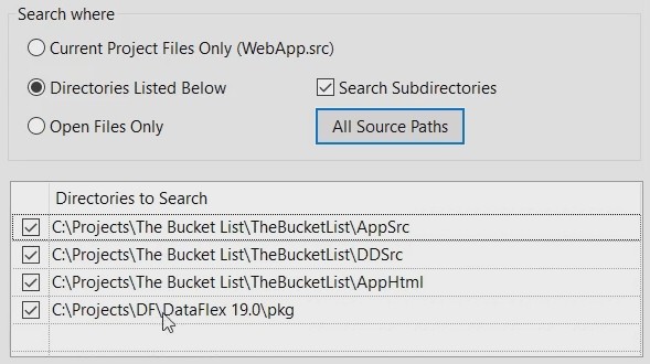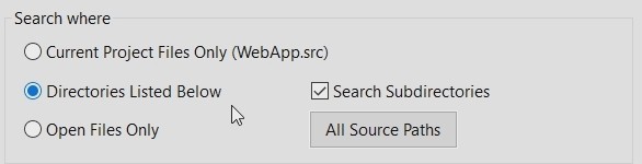 By clicking ‘All Source Paths’ it will add the paths that a project uses files from, so it will search all the files that are available to the project.