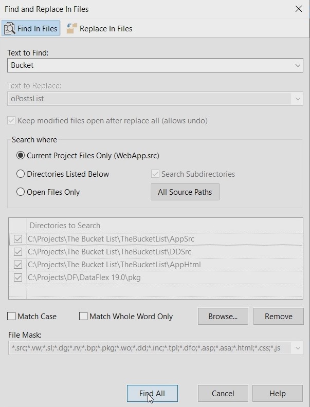 Select “Current project files’ and press ‘Find all’ to go through the files and search for the term that has been set in the ‘Text to Find’.