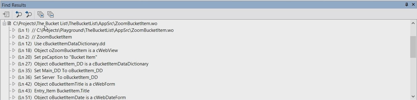 Expanding one of the results will show the exact lines of code where the term is being used, so in this case for example the ‘psCaption’ is being set to “Bucket Item”.